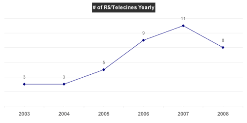 Plus inquiétant pour Hollywood, la qualité des versions piratées augmente, notamment grâce aux DVD de type R5 qui sortent dans les pays de zone 5 (l’ex Union Soviétique, l’Inde, une grande partie de l’Afrique…). Dans ces pays où le piratage est très fort, les studios ont trouvé pertinent de sortir un format de DVD spécial grâce auquel les films seraient proposés rapidement mais sans bonus, en qualité Téléciné, pour lutter contre les ventes de DVD screeners pirates. Sans surprise, ces R5 sont vite devenus des sources majeures de piratage sur Internet. Les studios avaient pris soin de ne pas insérer sur les R5 les bandes audio originales des films, mais les pirates remplacent la bande son par les versions locales américaines ou européennes, et gardent uniquement la vidéo de meilleure qualité. Le nombre des rips à base de R5 augmente ainsi chaque année…