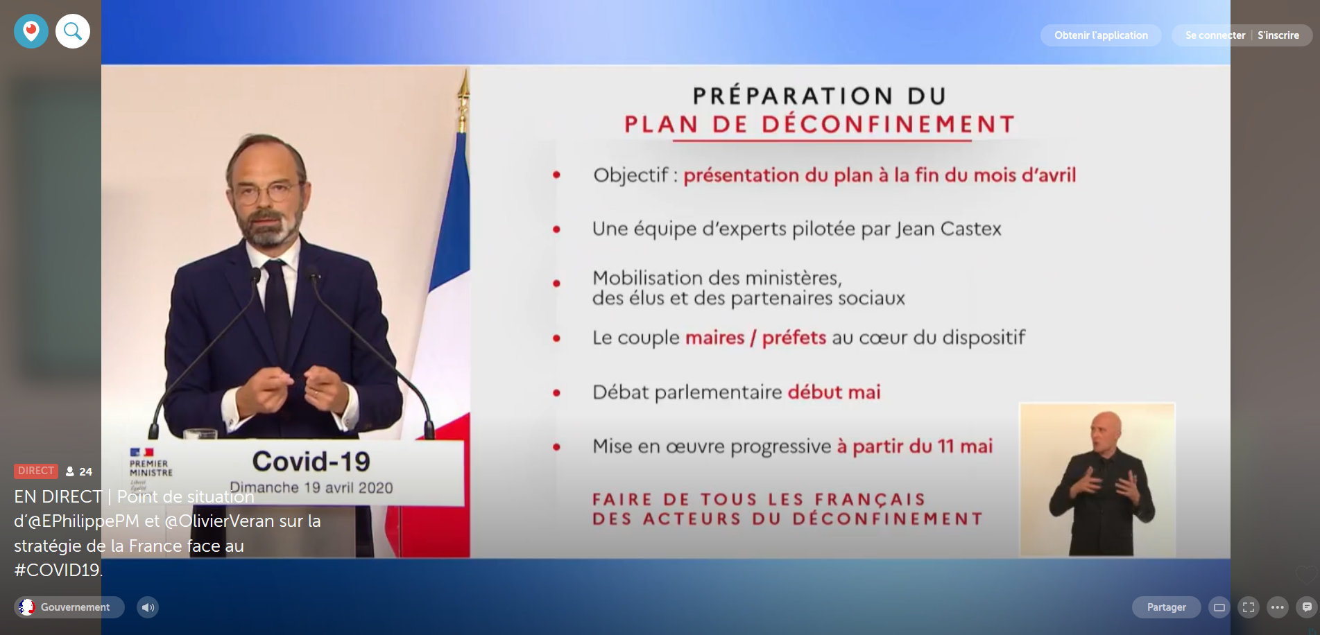 C’est dans un discours prononcé le 19 avril 2020 que le Premier ministre Édouard Philippe a précisé la situation en France et évoqué rapidement les grandes lignes du déconfinement, annoncé au mieux pour le 11 mai 2020 par le président de la République quelques jours plus tôt. Mais avant d’entrer dans les détails, M. Philippe a tenu à rappeler que la situation ne changerait pas du jour au lendemain : même si le confinement fonctionne et montre ses premiers résultats, « imaginer que l’épidémie serait derrière nous, ce serait une erreur », a-t-il indiqué.