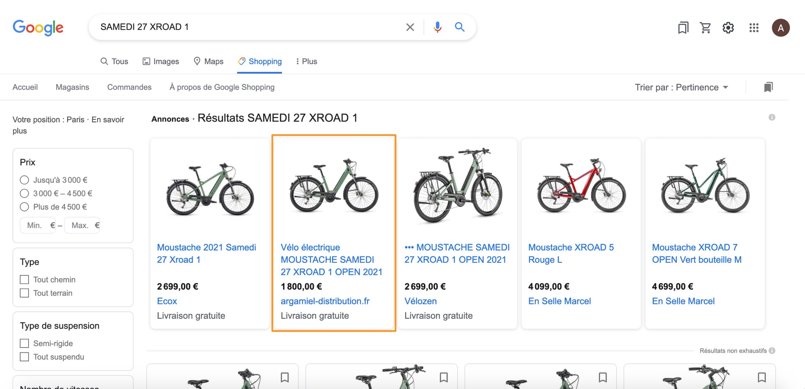 Une simple recherche sur des références de vélos à assistance électrique ou de trottinettes nous a permis de nous rendre compte que, sur de très nombreux produits, Argamiel Distribution apparaissait parmi les premiers résultats sur Google Shopping. De quoi garantir que ses prix très concurrentiels sauteraient aux yeux de nombreux internautes, et attireraient ainsi un grand nombre de victimes potentielles. Mais comment un site d’arnaque a-t-il pu se retrouver sur Google Shopping pendant aussi longtemps ?