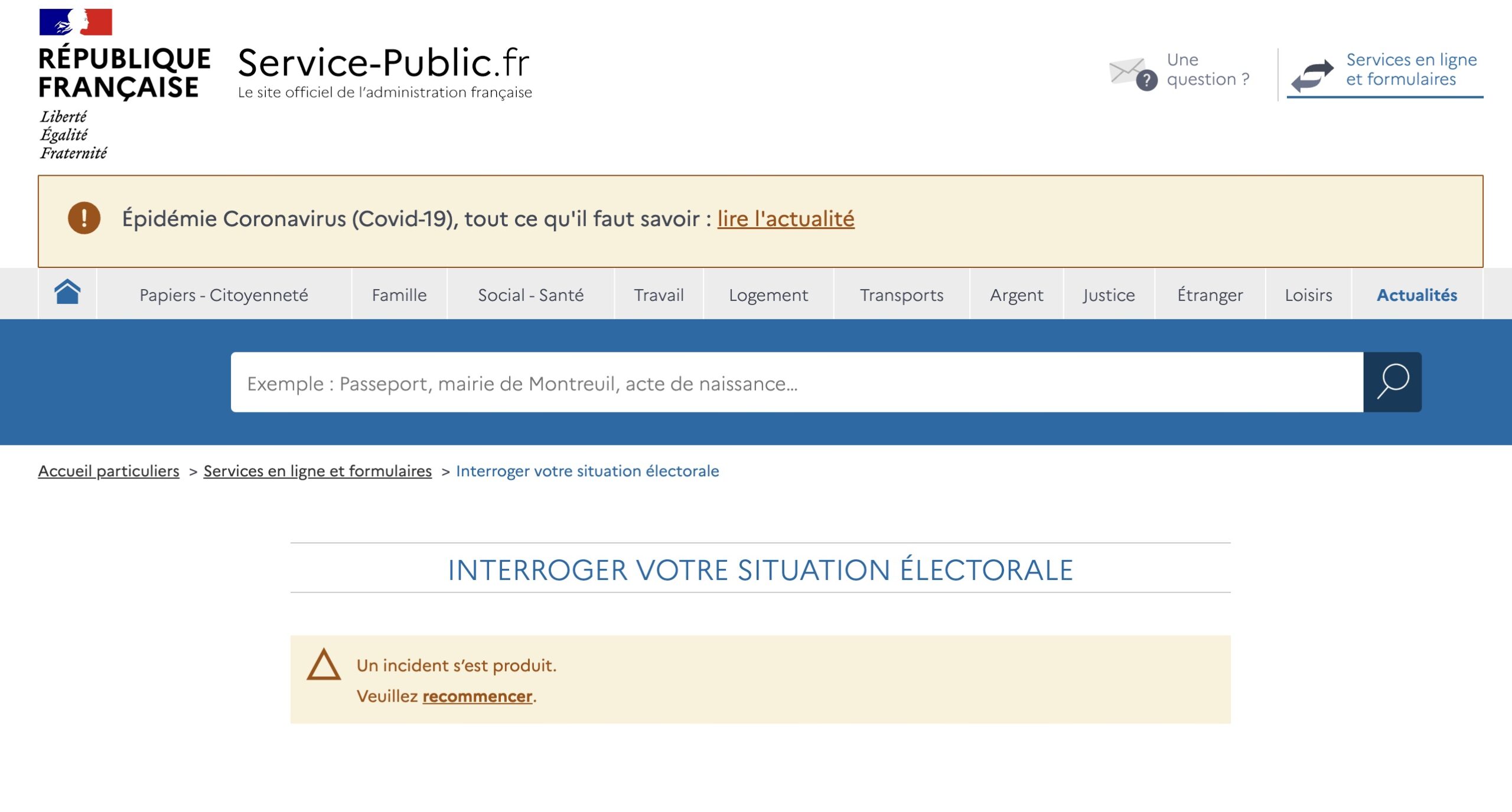 Numerama a fait le test, avec les informations de plusieurs citoyens et citoyennes françaises, bien inscrites sur les listes électorales. Une fois toutes les données requises renseignées, le site affiche : « Un incident s’est produit. Veuillez recommencer.»