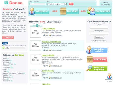 Vous connaissez tous eBay, PriceMinister, 2xMoinsCher et tout un éventail de sites qui proposent aux internautes de vendre aux enchères les objets dont ils n’ont plus l’utilité. En marge de cette économie marchande se développe cependant une économie du don, bien connue des amateurs de P2P, de wikis et de logiciels libres, et qui débarque maintenant pour les objets physiques. Donoo, un nouveau venu sur le web, propose ainsi aux internautes qui le souhaitent de référencer les objets qu’ils veulent bien donner, gratuitement, à d’autres.