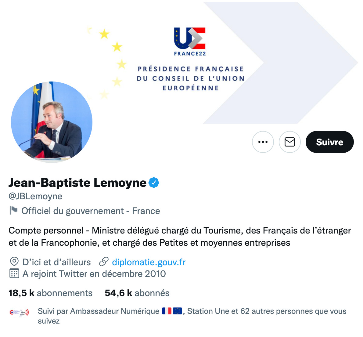 C’est la même chose sur le compte du ministère de l’Éducation Jean-Michel Blanquer, qui affiche depuis au moins le 2 avril la mention « compte personnel », ce qui n’était pas le cas le 15 mars selon Web Archive, ou encore pour Olivia Grégoire, secrétaire d’État chargée de l’Économie solidaire, qui n’avait pas cette phrase le 24 mars dans sa bio Twitter. Web Archive indique la même chose pour Jean-Baptiste Lemoyne, ministre délégué chargé du Tourisme, qui n’avait pas cette mention sur son compte Twitter le 16 mars. Olivier Dussopt, ministre délégué chargé des Comptes publics, est le seul qui avait déjà la phrase dans sa description au mois de mars — mais l’addition est tout de même récente, car en février, la description du ministre sur Twitter ne précisait pas qu’il s’agissait de son « compte personnel ».