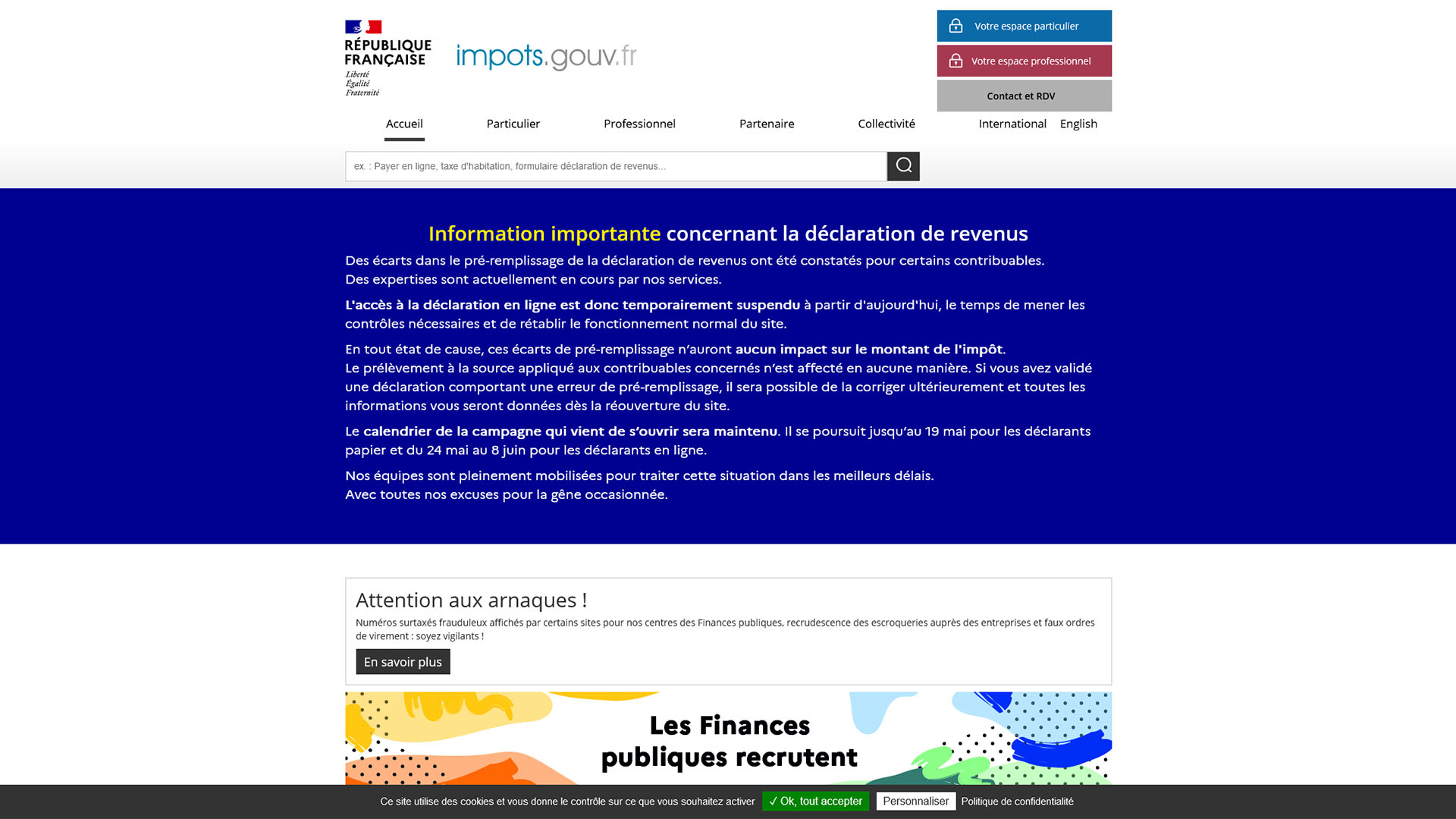 Un encart d’avertissement est visible pour qui se rend sur le site des impôts ce 8 avril 2022. Les causes de ces erreurs ne sont pas encore élucidées, mais Bercy affirme que « ces écarts de pré-remplissage n’auront aucun impact sur le montant de l’impôt », tandis que « le prélèvement à la source appliqué aux contribuables concernés n’est affecté en aucune manière. »