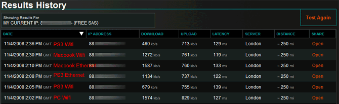 Nous avons également comparé les performances du test Speedtest.net entre la Playstation 3 et deux ordinateurs.Malheureusement, Microsoft n’ayant toujours pas implanté de navigateur sur la Xbox 360, nous n’avons pas pu comparer les résultats à la console de Microsoft. Nous avons utilisé le même routeur, relié à la même Freebox, avec un PC connecté en Wifi uniquement, une Playstation 3 connectée alternativement en WiFi ou en Ethernet, ainsi qu’un Macbook relié en Ethernet puis en WiFi, placé à quelques centimètres de la PS3. A chaque fois, aucun téléchargement n’était initié en parallèle, et l’UpNP était activé pour la configuration automatique du routeur :