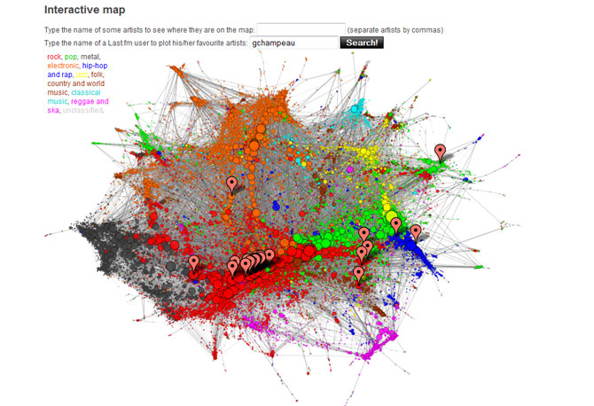 A quoi ressemblerait la musique si l’on pouvait réaliser une carte pour se repérer dans la diversités des genres musicaux et des artistes ? Le chercheur de l’université de Budapest Nepusz Tamas a rassemblé des millions de données issues de l’API de Last.fm pour réaliser une carte d’un grand nombre d’artistes et d’utilisateurs. En tout, quatre millions de connexions sont rassemblées pour dessiner les liens entre les différents artistes, basés sur le taux de similarité fourni par Last.fm. Les artistes sont également placés sur la carte en fonction de la proximité des utilisateurs qui les écoute.