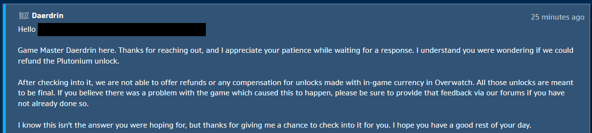 D’après ce joueur, il se pourrait que le jeu interprète mal la manière dont le texte est tapé dans le chat, et qu’il croit qu’il s’agit d’une navigation dans le menu du jeu. « Malheureusement, pour débloquer un skin, il suffit d’appuyer 2 fois sur la barre d’espace, ce qui peut se produire en une fraction de sonde lorsque vous appuyez dessus des dizaines de fois par phrase. » Raindrac a sollicité Blizzard, qui a répondu qu’il n’était pas envisageable de rembourser cet achat. « Tous ces déblocages sont définitifs », répond le développeur du jeu.