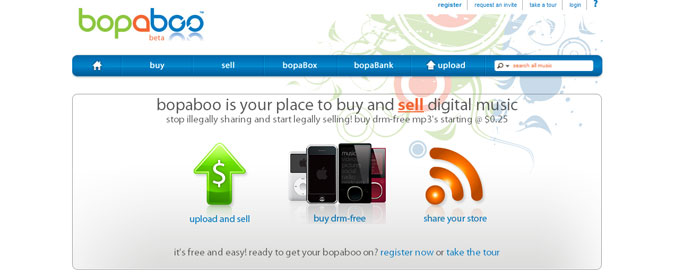 Les internautes peuvent ainsi uploader les MP3 qu’ils veulent revendre, et recevoir 80 % des sommes collectées. Le site ne vend pas plus d’exemplaires du fichier musical qu’il n’en a reçu en upload, recréant ainsi les conditions du marché physique dans l’univers numérique. De leur côté, les consommateurs peuvent acheter sur Bopaboo des fichiers MP3 d’une qualité identique à celle qu’ils trouvent sur iTunes, mais pour un quart du prix. Les MP3 sont en effet tous revendus 0,25 $ pièce.