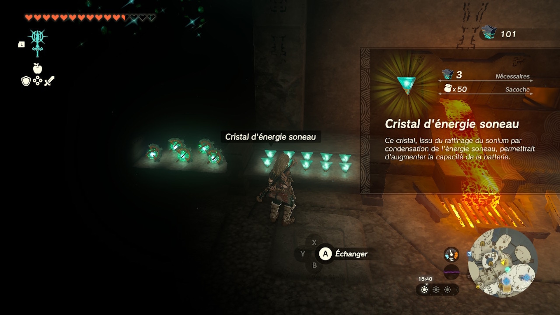 Ces robots ne renforceront pas gratuitement votre batterie. Il faudra leur fournir 100 cristaux d’énergie soneau, une ressource rare « issue du raffinage du sonium », par jauge supplémentaire. Pour ce faire, il faudra explorer les profondeurs d’Hyrule de fond en comble, ce qui n’est pas une sinécure (la visibilité est très réduite, les ennemis sont particulièrement puissants). On peut dénicher des cristaux d’énergie soneau directement dans des coffres (bien protégés) ou en battant des boss (comme celui de la capture ci-dessous).