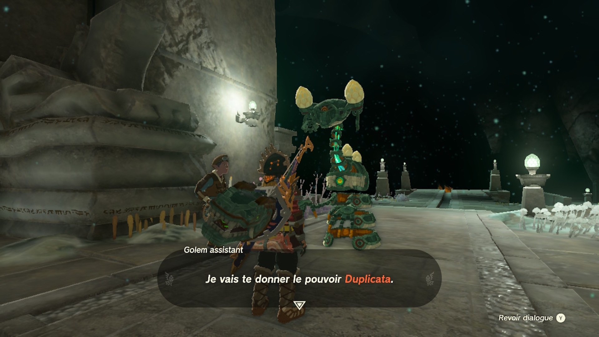 Dans les profondeurs, vous pourrez rapidement activer une racine pour illuminer les alentours (Racine Inog Qoyq). Une fois cette étape remplie, vous verrez au loin un bâtiment qui s’avère être le temple recherché. Il s’agit en réalité d’une grande mine, où un golem assistant vous accueille et vous confie Duplicata sans aucune contrepartie. Un petit tutoriel se déclenche alors pour apprendre à l’utiliser, puis s’ensuit un combat contre un boss dont on ne vous dira rien.