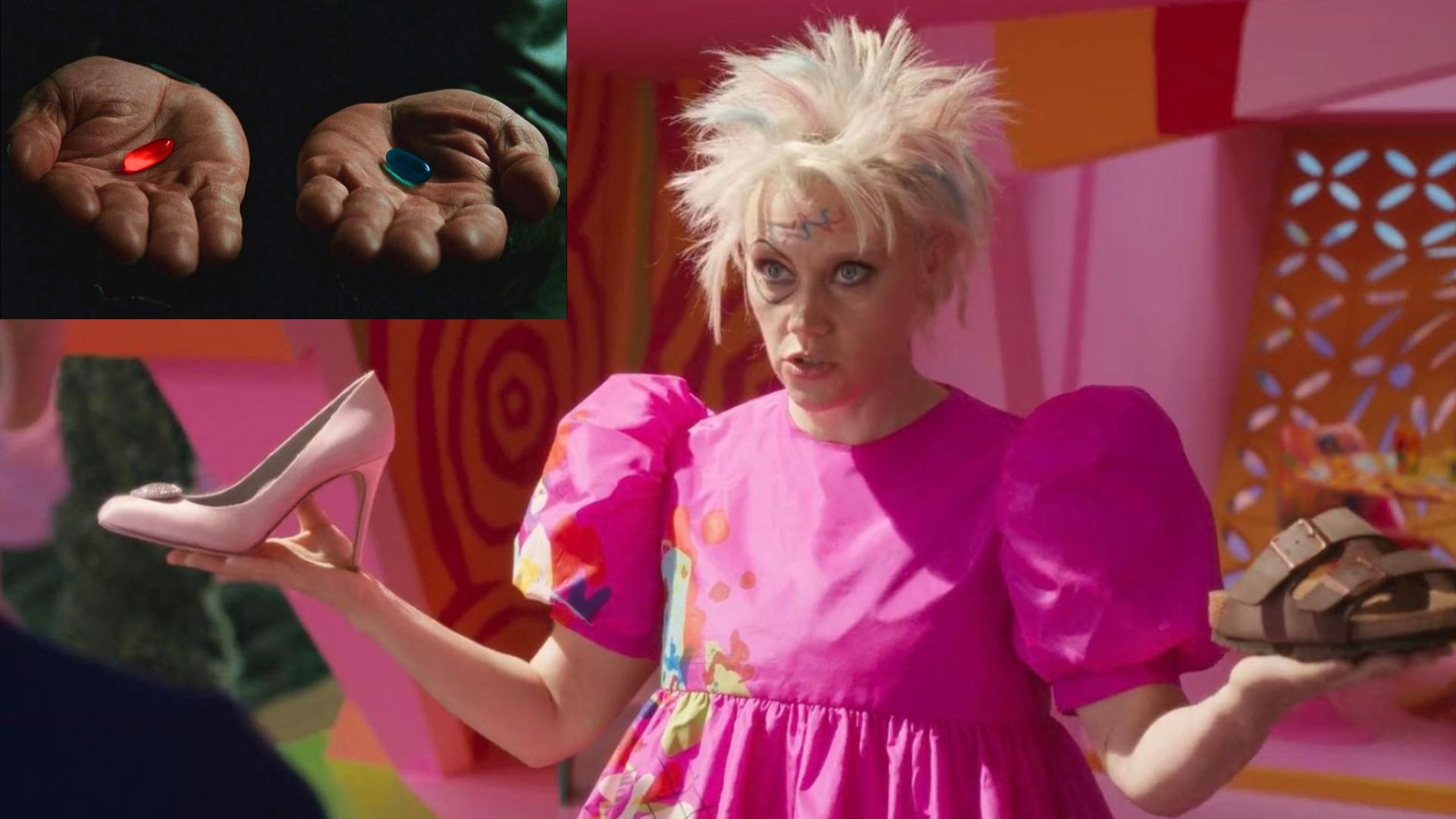 Le point de bascule, c’est la rencontre avec celle qui connaît déjà tout de la porosité des deux mondes : Weird Barbie, ou la « barbie bizarre » qui a déjà été atteinte par le véritable monde. À l’image d’un Morpheus qui aurait troqué le manteau en cuir noir contre une robe rose colorée, elle lui révèle une réalité plus large. Weird Barbie lui présente ensuite deux chaussures : un escarpin, si elle souhaite rester, et une sandale, si elle veut découvrir le vrai monde.