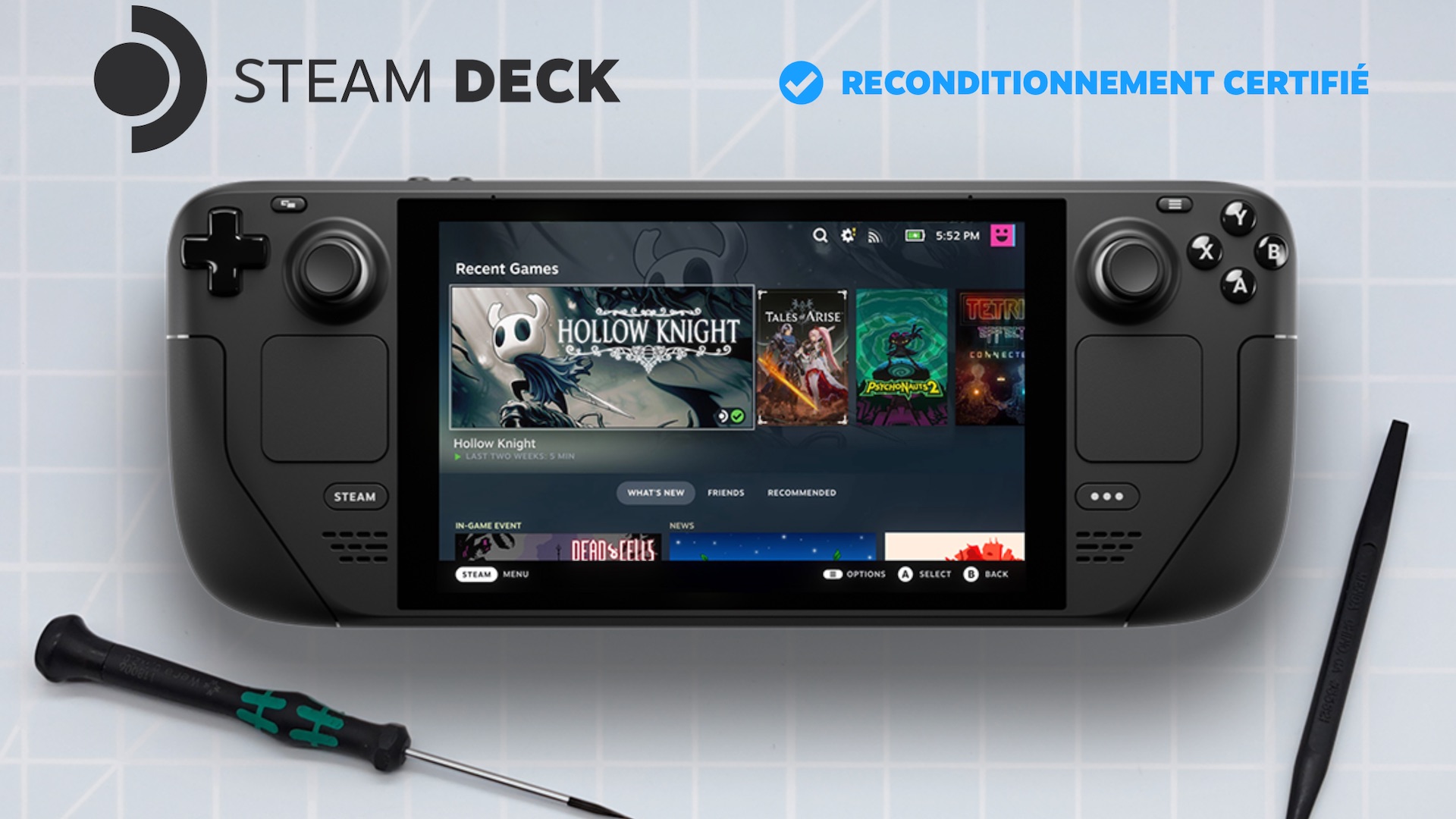 « Économisez jusqu’à 20 % en achetant un Steam Deck reconditionné et entièrement testé », annonce Valve sur la page de sa console portable. Depuis le 8 août 2023, il est possible d’acheter des Steam Deck reconditionnés. Ce qui permet au produit d’être plus accessible que jamais, en descendant sous la barre des 350 € pour la version de base (64 Go, que l’on déconseille). De cette manière, Valve évite le gaspillage, sachant que « tout Steam Deck reconditionné certifié a été dument examiné et répond aux mêmes standards de qualité que n’importe quel Steam Deck neuf destiné à la vente ».