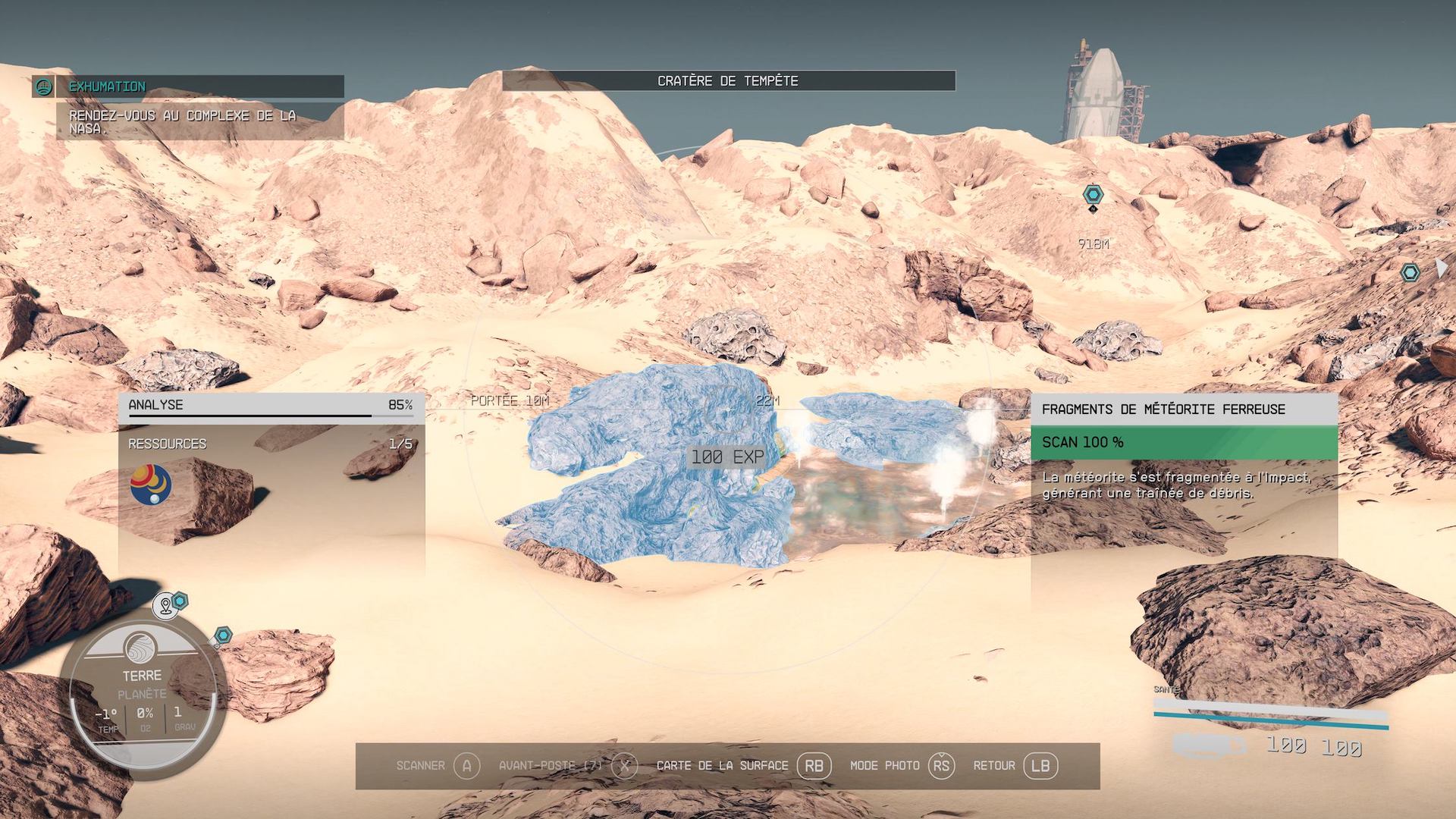 À l’extérieur, la Terre version Starfield ressemble à un immense désert où il n’y a plus âme qui vive. En marchant pendant quelques minutes vers l’inconnu, dans un No Man’s Land presque flippant, on pourra tomber sur des cratères ou des grottes cachant un soupçon de ressources à récupérer. Il y en a cinq : dysprosium, chlore, fer, eau et plomb.