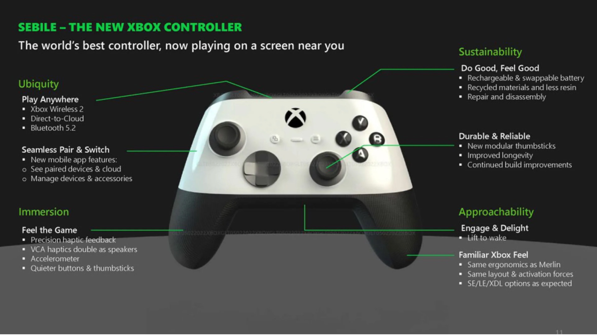 Microsoft ne se contenterait pas d’une nouvelle Xbox Series X. Ses plans intègreraient aussi une manette inédite, connue sous le nom « Sebile ». Elle aurait un look bicolore (blanc et noir), s’appuierait sur des matériaux recyclés (moins de résine) et proposerait une batterie interchangeable. Le désassemblage et la réparation seraient par ailleurs facilités. En termes d’ergonomie, on conserverait l’esprit Xbox d’aujourd’hui, avec l’exact même disposition des boutons.