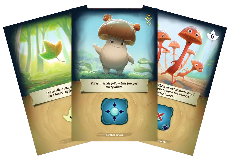 Notre première surprise en découvrant Mycelia porte sur la beauté de ses illustrations. Là où la plupart des autres jeux de deckbuilding sont plutôt vilains (c’est la mécanique qui importe, on lésine sur le reste) et proposent des univers froids, violents, et quelconques, c’est tout le contraire ici.