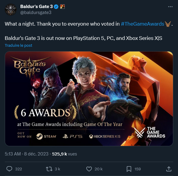 « Quelle soirée. Merci à tous ceux qui ont voté durant les Game Awards. » C’est par un message d’une étonnante banalité que Baldur’s Gate III a commenté le résultat des « oscars » du jeu vidéo, dont la cérémonie s’est tenue dans la nuit du 7 au 8 décembre. Un commentaire lapidaire, qui ne permet pas de prendre la mesure du succès remporté par le jeu de Larian Studios.