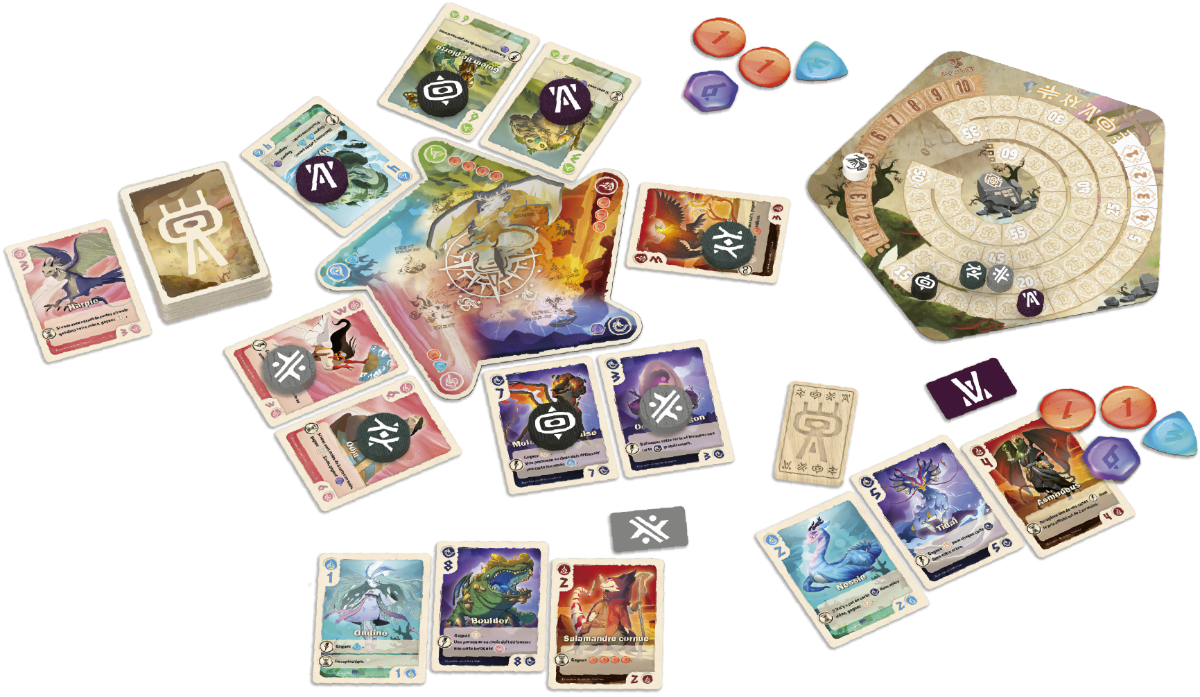 Chaque joueur prend les deux pions à sa couleur. Le reste du matériel (les deux plateaux, les pierres magiques et le tas de cartes de créatures) est placé au centre de la table.