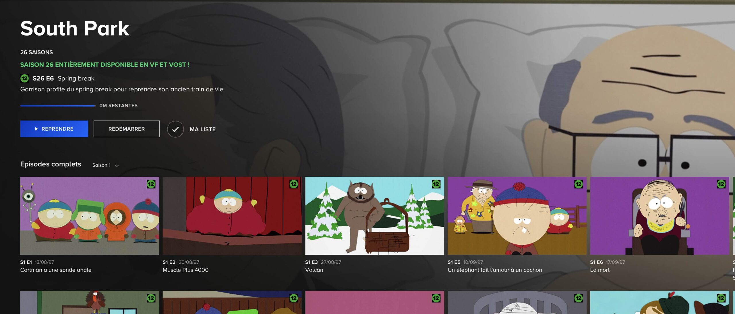 Depuis 2022, c’est Paramount+ qui diffuse South Park en France. La plateforme dispose d’un avantage de taille sur ses concurrents : elle possède les droits de South Park (Comedy Central, son diffuseur historique, appartient au même groupe). Paramount+ diffuse même en exclusivité des téléfilms dans l’univers de la série, au grand désarroi du groupe Warner Bros (qui pensait avoir sécurisé les droits de la série pour sa plateforme MAX aux États-Unis).