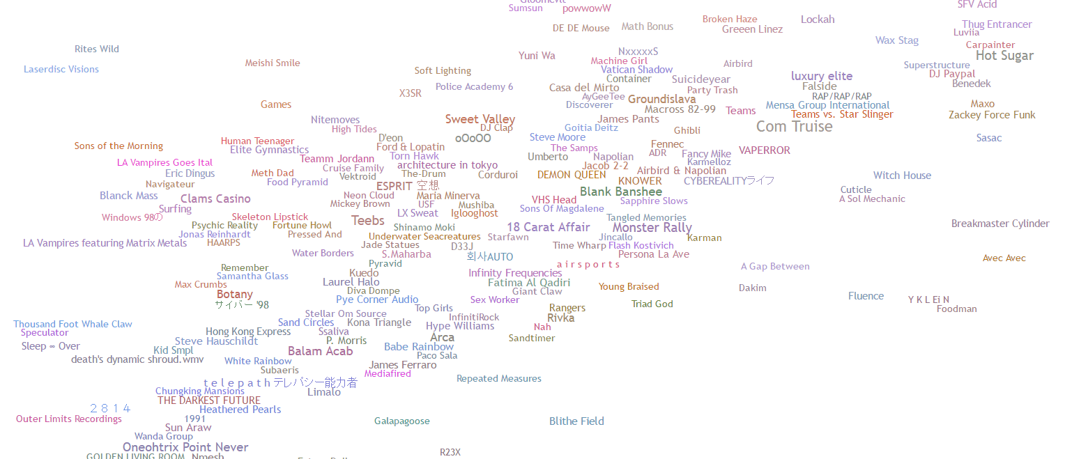 Every Noise at Once propose donc une carte des 1 448 genres musicaux disponibles sur Spotify. La carte générée automatiquement vous permet ensuite d’explorer de manière quasi-infini la plus grande discothèque du monde : le web. En passant d’un genre à l’autre dans l’interface épurée d’Every Noise, on découvre des sous-genres obscurs qui vont nous passionner ou des artistes maudits que nous n’aurions jamais connu.