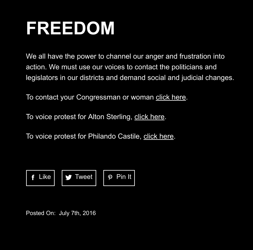 Beyoncé déclare ainsi, dès ce jeudi, que « c’est à nous de prendre position et de demander qu’ils arrêtent de nous tuer ». Mais au-delà d’en appeler à la conscience de chacun, elle a volontairement glissé à la fin de son message un lien direct pour appeler, comme c’est courant aux États-Unis, les congressistes à agir sur un sujet.