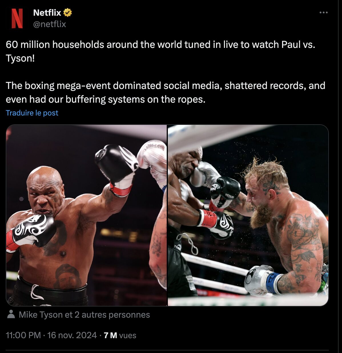 Selon Netflix, 60 millions de foyers ont regardé le match entre Jake Paul et Mike Tyson dans le monde, ce qui est son record historique. L’entreprise parle même d’un pic à 65 millions de téléspectateurs, qui n’a rien à envier aux plus grands événements télévisuels. Le coup médiatique est réussi.