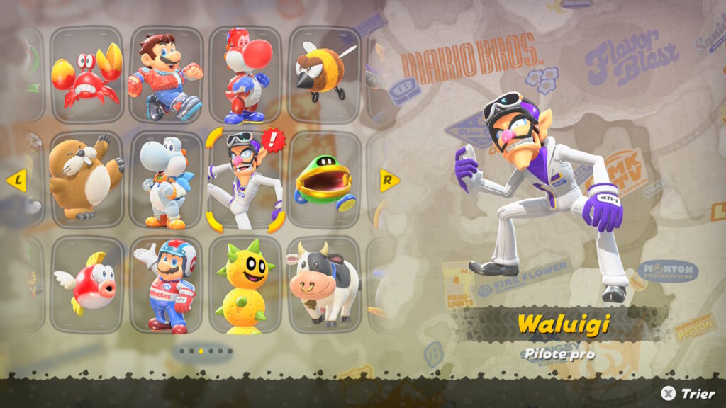 En plus des personnages incontournables de l’univers Mario, Mario Kart World introduit plein de nouveaux personnages secondaires comme la vache, Cheep Cheep ou Goomba. La plupart sont disponibles dès le lancement du jeu, mais d’autres se débloquent en roulant, en se faisant maudire par Kamek (un des nouveaux objets sur la piste).