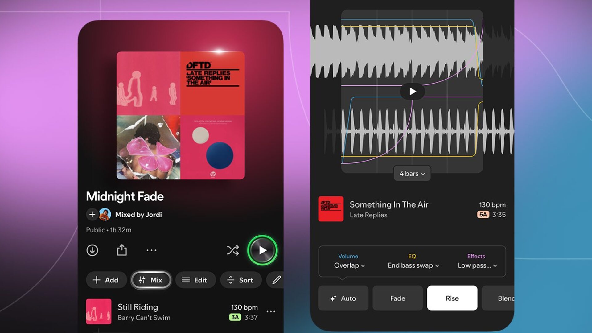 Contrairement à Apple Music, qui déploie son AutoMix entre tous les morceaux, Spotify réserve la fonction Mix aux playlists. Les utilisateurs ont le choix entre une transition « Auto », comme chez Apple, ou une personnalisation manuelle, avec des options prédéfinies (« Fade » et « Rise »). Ils peuvent aussi ajouter leurs propres effets, faire évoluer la transition et tester différents mixages. Autant de possibilités qu’Apple Music n’offre pas.