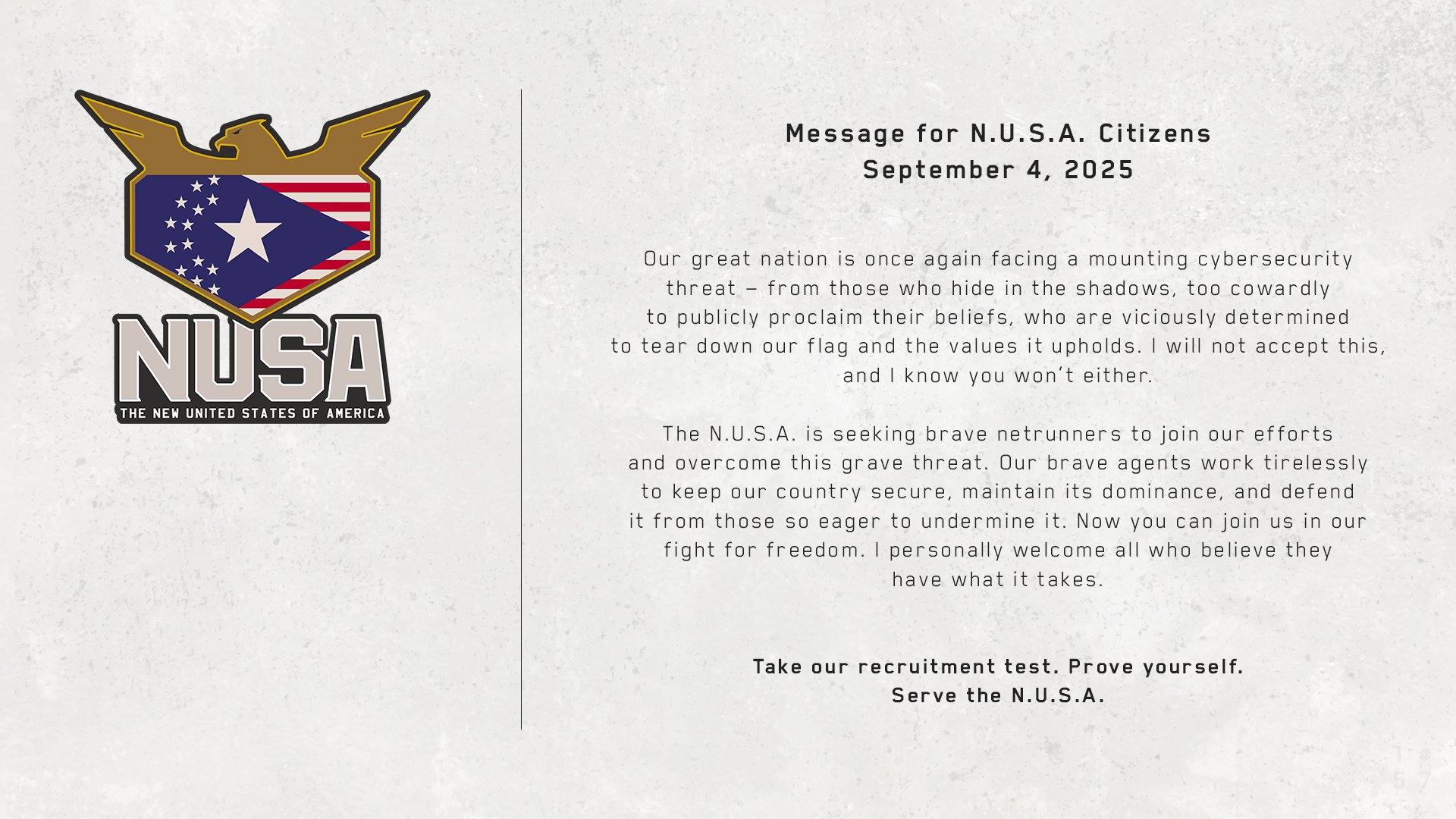 La N.U.S.A. recherche de courageux netrunners pour se joindre à nos efforts et surmonter cette grave menace. Nos braves agents travaillent sans relâche pour garder notre pays sûr, maintenir sa domination et le défendre contre ceux qui cherchent tant à le saper. Maintenant, vous pouvez nous rejoindre dans notre combat pour la liberté. J’accueille personnellement tous ceux qui pensent avoir ce qu’il faut. »