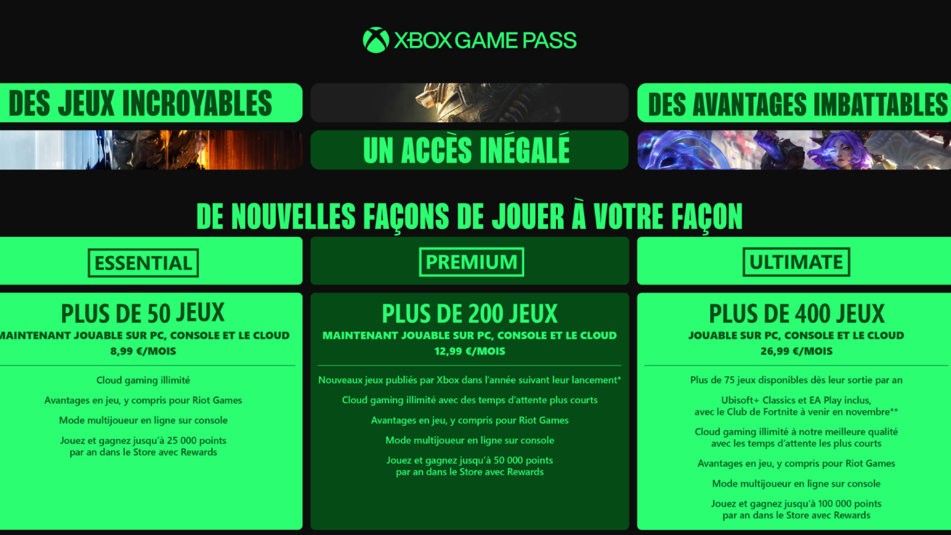 - Ultimate à 26,99 € par mois : plus de 400 jeux, les exclusivités day one, Ubisoft+ Classics, EA Play, Fortnite Club et une expérience cloud premium.