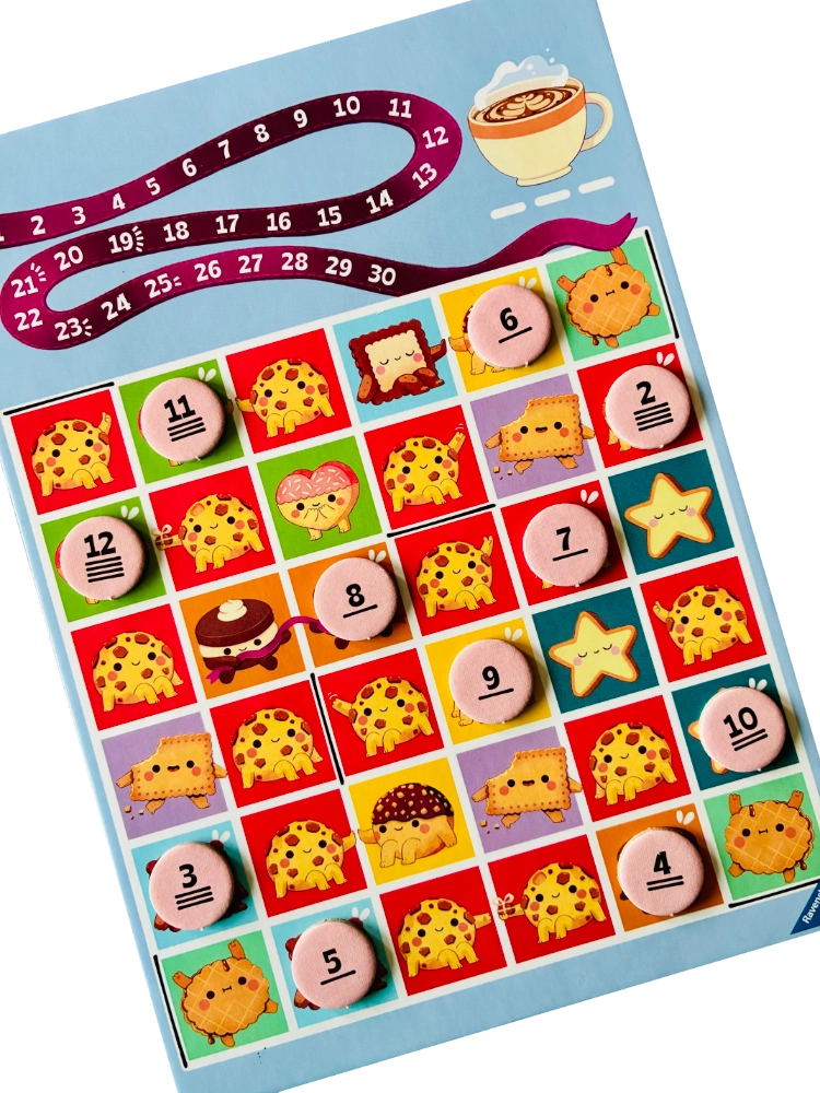 Chaque joueur dispose d’un plateau personnel, une grille de 36 cases représentant chacune l’un des huit types de cookies tout mignons. Onze jetons numérotés de 1 à 12 sont placés au hasard sur certaines de ces cases. Et voilà, la mise en place est déjà terminée. Et le reste des règles est tout aussi simple.