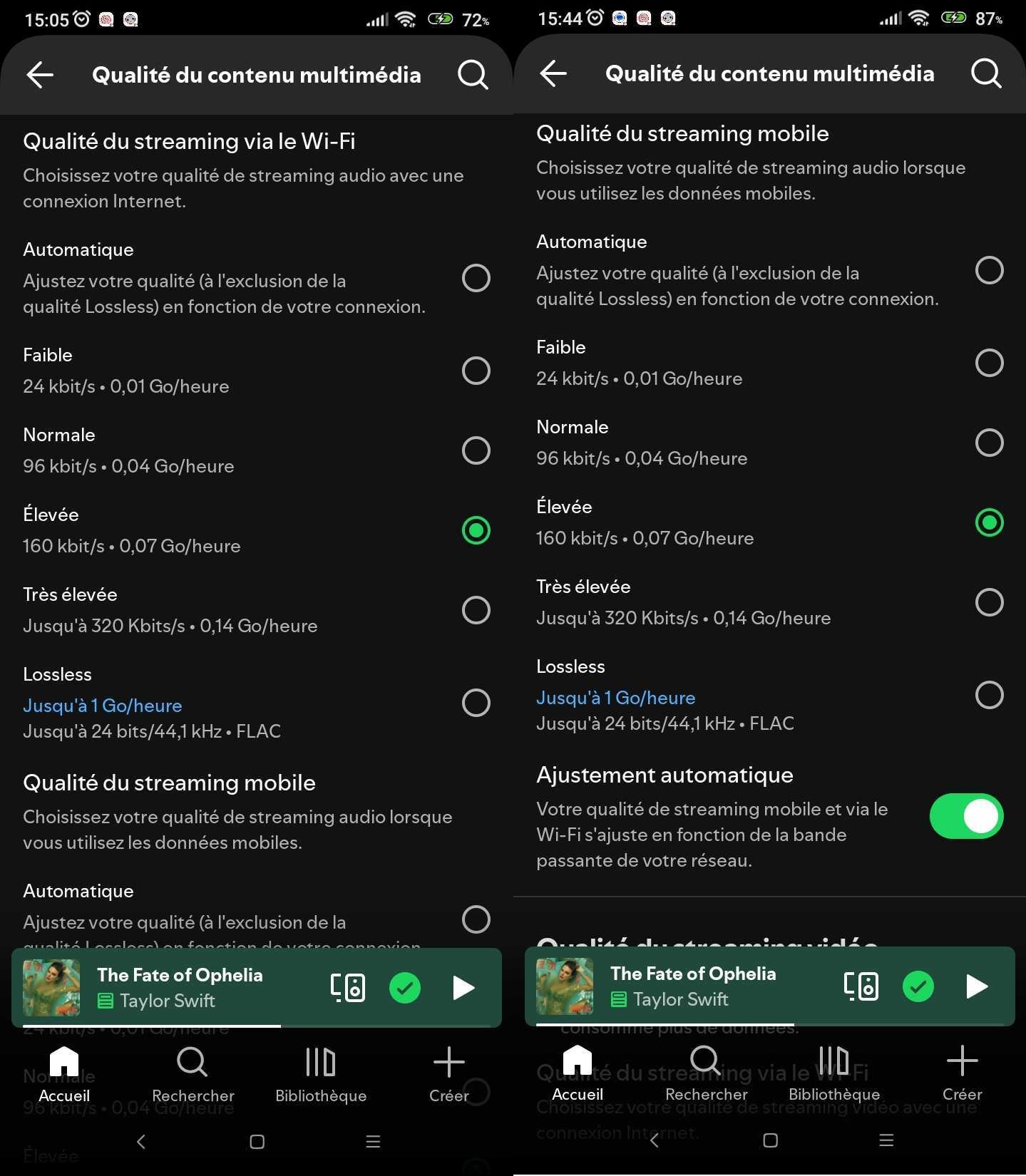 C’est ici que vous pouvez piloter la finesse musicale des titres que vous streamez ; plus vous choisissez une qualité faible, plus l’empreinte sur votre consommation Internet sera légère. À l’inverse, plus le flux audio est sans perte, plus il va peser sur votre connexion. Il vaut mieux donc avoir un forfait digne de ce nom, avec un débit suffisant.
