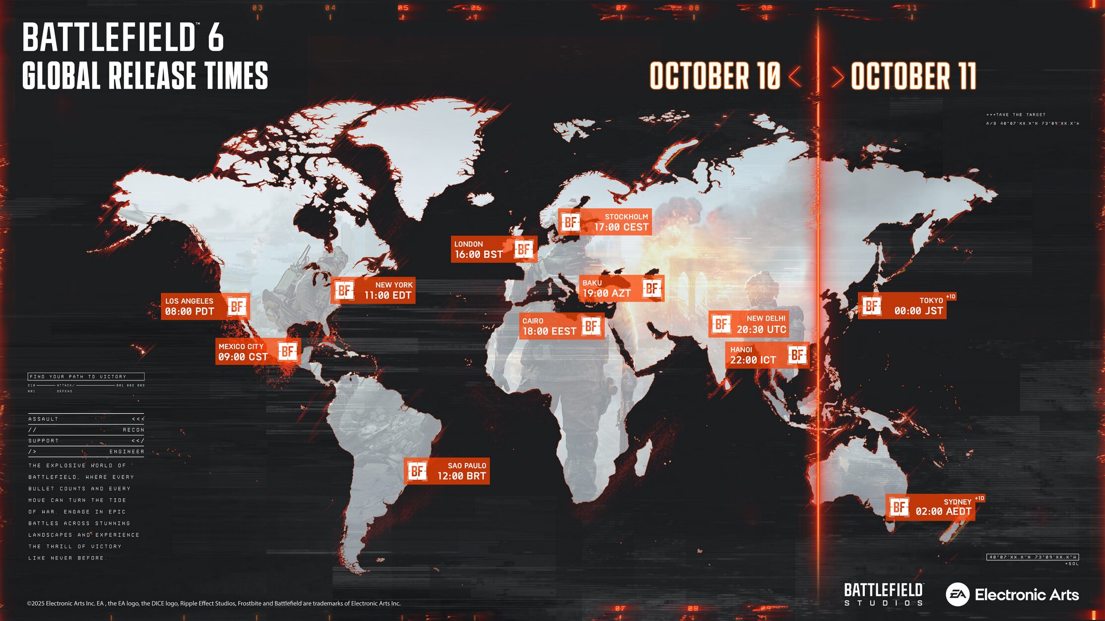 EA a partagé le 3 octobre une mappemonde montrant les horaires de sortie de Battlefield 6. Bonne nouvelle concernant l’Hexagone : l’ouverture des portes est prévue en milieu d’après-midi, à partir de 17 heures. Cela laisse donc largement la soirée pour commencer à voir ce que le FPS a dans le ventre — si on n’a pas joué à la bêta.
