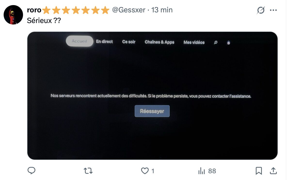 En ligne, les signalements concernent majoritairement le streaming vidéo et les difficultés d’accès à l’application myCANAL, aussi bien sur smartphones que sur téléviseurs connectés. Plusieurs utilisateurs indiquent sur les réseaux sociaux ne plus pouvoir lancer leurs programmes, que ce soit en direct ou en replay.