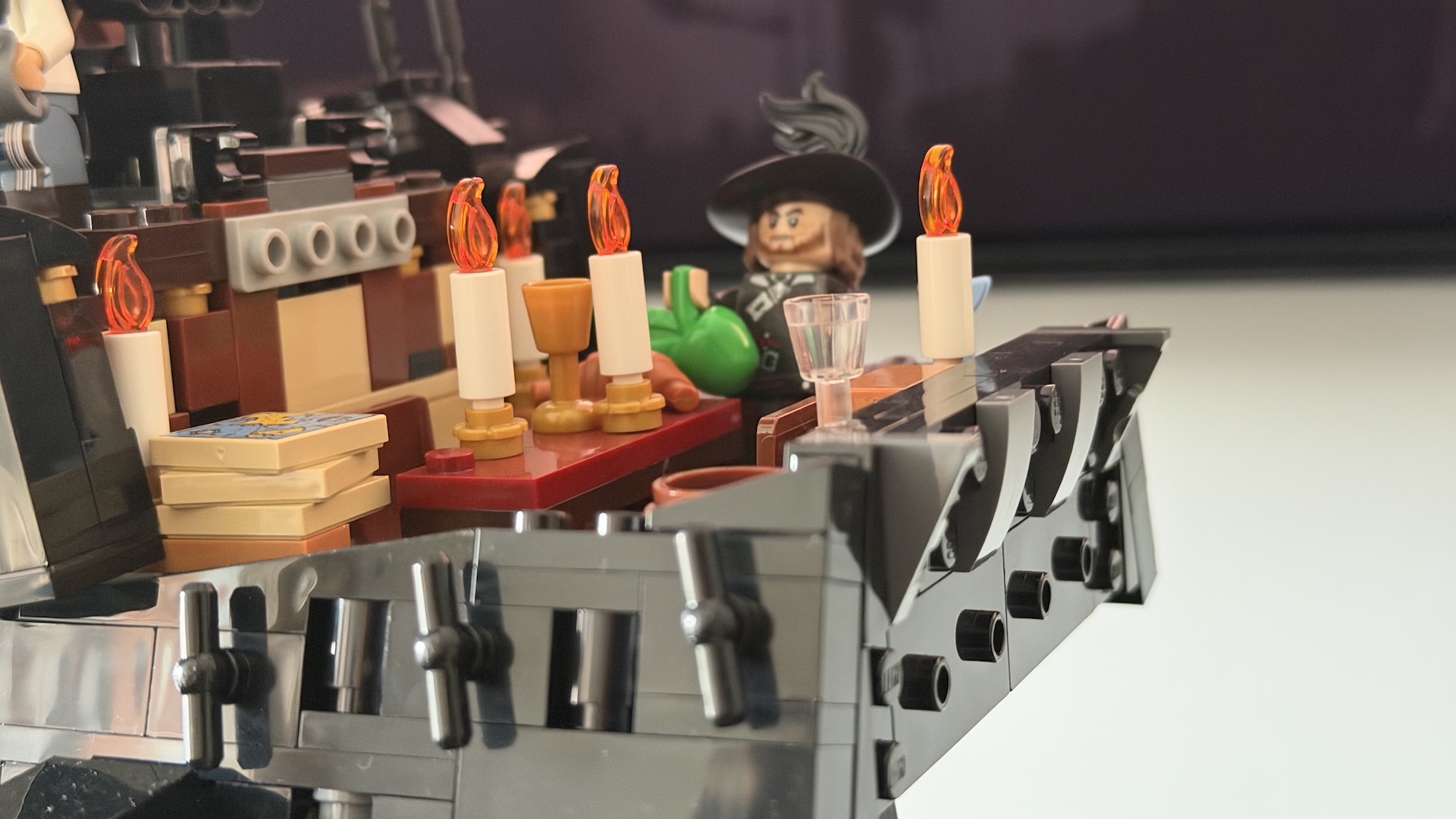 Si l’aspect très noir du bateau peut être déprimant pour un jouet (c’est le cas dans les films), sa construction est une redécouverte permanente. Lego a implémenté quelques petits mécanismes bien pensés, qui font entrer ce bateau dans une dimension supérieure. Les canons ? Les concepteurs ont pensé à une interaction astucieuse qui les font tous sortir en même temps (du même côté, uniquement). Le gouvernail ? Il tourne quand on actionne la barre à roue dans une direction. Les voiles sont parfaitement tendues. L’arrière du bateau peut être soulevée pour dévoiler une petite tablée — avec la célèbre pomme que chérit tant Hector Barbossa pour la référence. Il y a même un emplacement pour la barque, qui repose sur une cachette à trésors, et une figure de proue en forme d’ange. En somme, pour un produit d’exposition, il y a de quoi montrer pour épater la galerie.