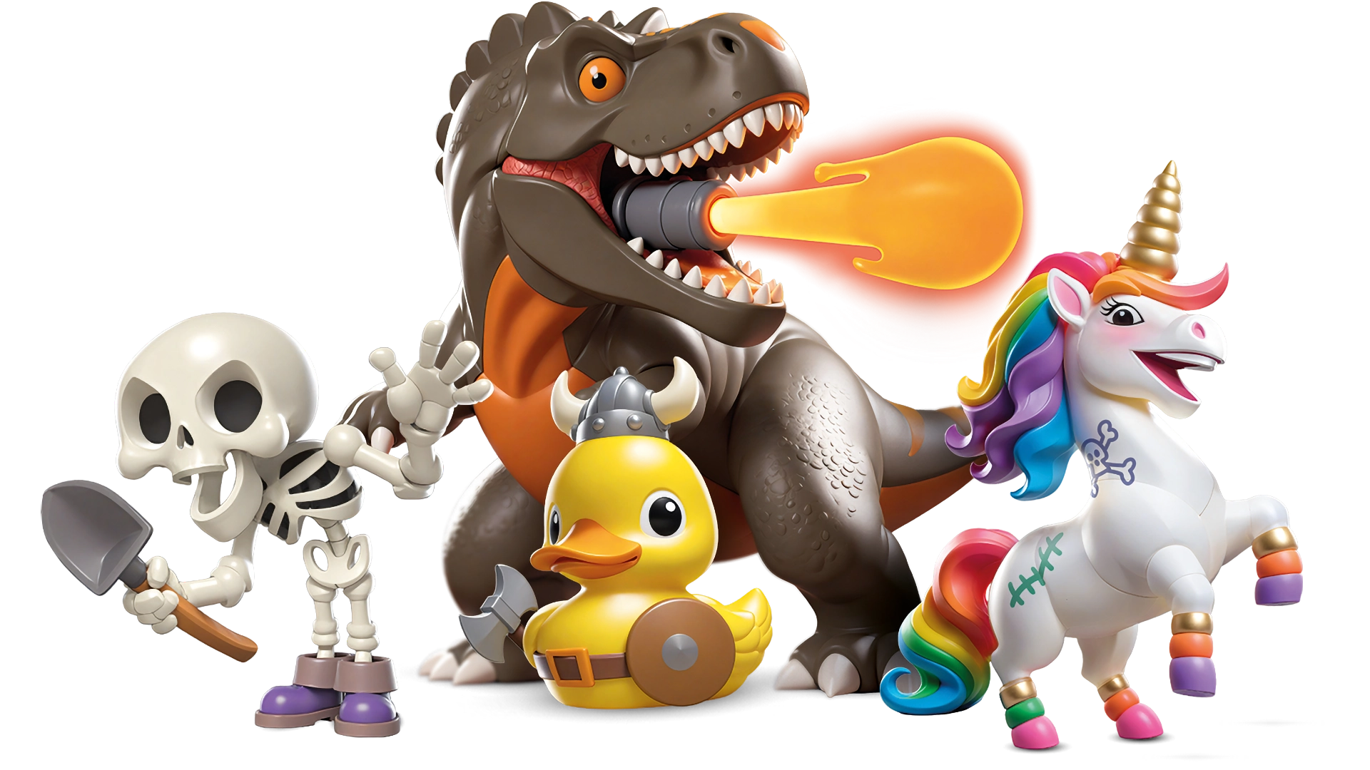Chaque troupe existe en trois exemplaires dans votre armée et possède une force ainsi qu’un effet particulier. Le squelette (force 1) permet de piocher deux troupes supplémentaires. Le robot (force 5) oblige l’adversaire à défausser une troupe au hasard de son chevalet. Le dinosaure (force 7) n’a pas d’effet, mais balaye tout sur son passage. Le petit canard en plastique, quant à lui, peut être posé sur n’importe quelle troupe, quelle que soit sa force… mais se fait battre par tout le monde.