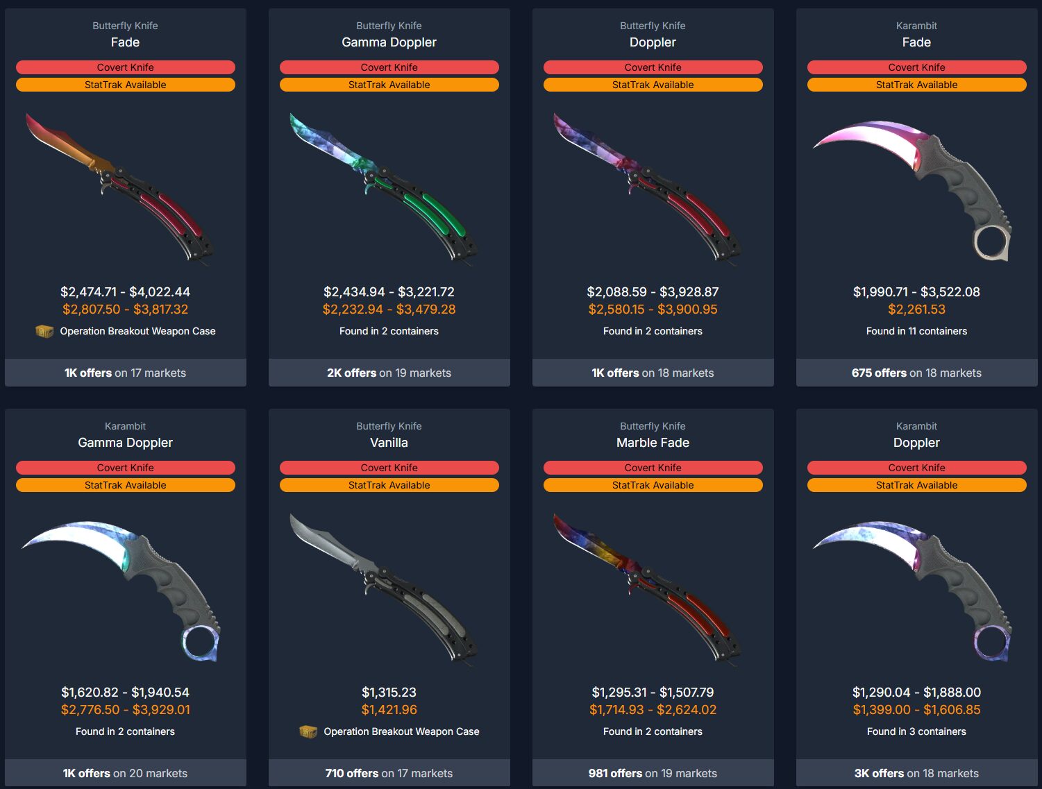 Il suffit d’échanger seulement cinq skins rouges contre un couteau garanti ou une paire de gants (en fonction de la collection). Or, dans l’économie de Counter-Strike, les couteaux (et les gants) sont considérés comme les objets les plus rares et sont souvent aussi les plus chers. Ce simple ajustement a suffi à faire basculer le marché.