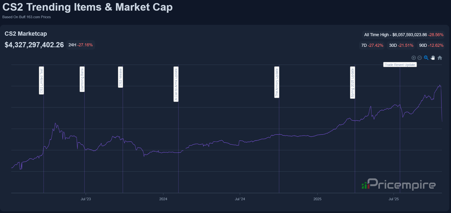 Ce bouleversement est exceptionnel à plus d’un titre. Il rappelle à quel point le marché des skins reste entièrement dépendant de Valve : une simple ligne de mise à jour suffit à redistribuer les cartes et à faire vaciller des économies personnelles parfois colossales. Cette fragilité est d’autant plus notable que le marché secondaire des skins — bien que seulement toléré par Valve — avait fini par atteindre un niveau délirant au fil des années. Certains les considéraient comme une véritable classe d’actifs à part entière comme les actions ou les cryptomonnaies. Du moins il se comportait de même, avec une volatilité moindre que celle des cryptomonnaies, d’après les analyses du média Bloomberg.