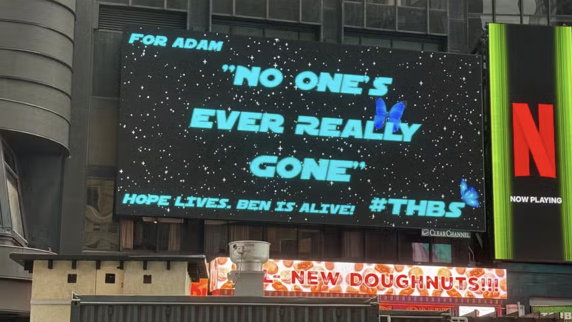Il s’agissait d’abord d’un avion survolant les studios Disney, dès le 23 octobre, et portant une bannière les suppliant de « Sauver The Hunt for Ben Solo ». Désormais, une nouvelle action vient rejoindre le mouvement : la mise en place d’un panneau publicitaire, en plein milieu de la ville de New York, le 26 octobre. D’après Collider, on pouvait y lire l’inscription suivante, toutes les 28 minutes : « Pour Adam. Personne n’est jamais totalement perdu. L’espoir vit toujours. Ben est vivant ! »