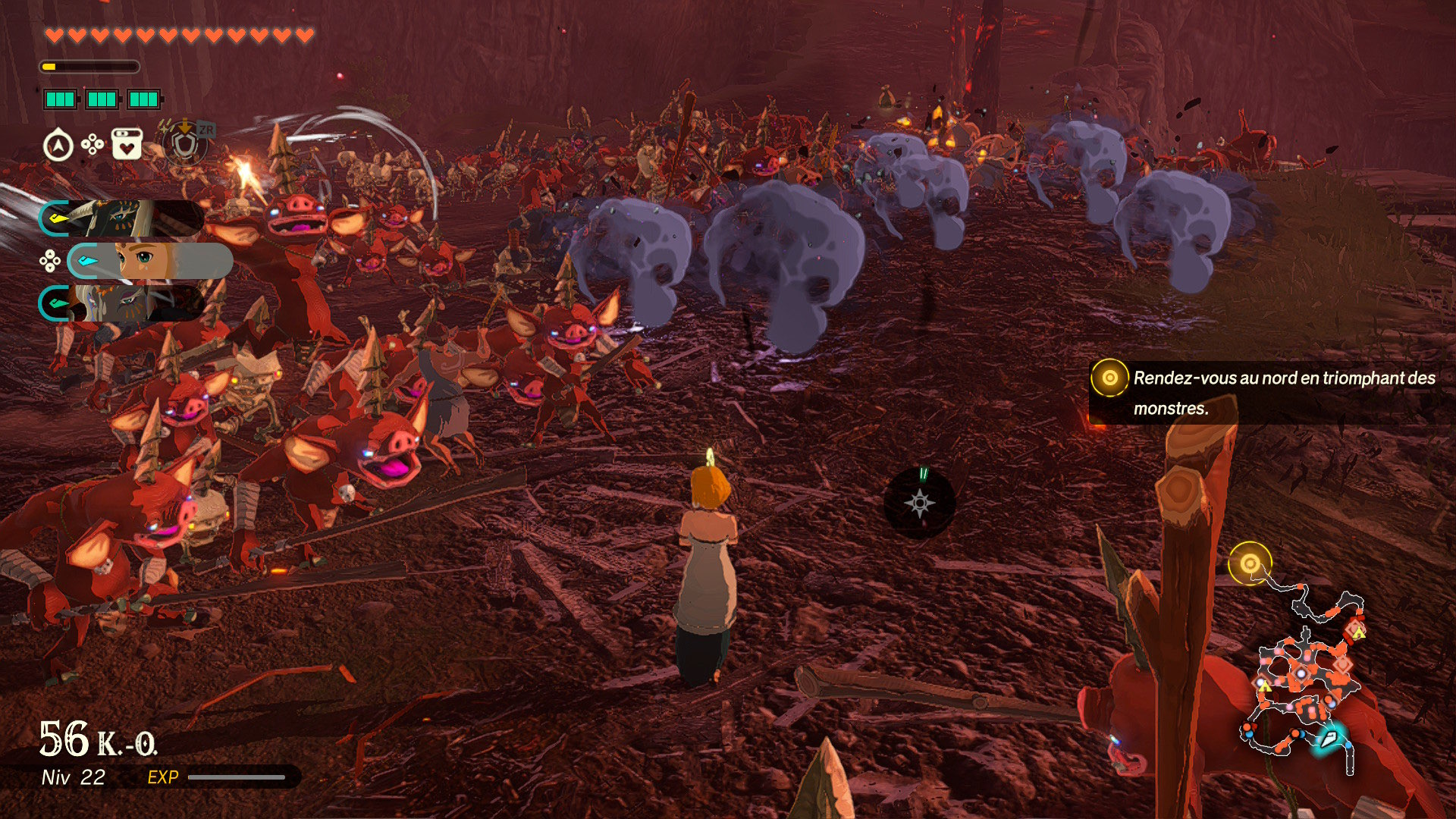 Il ne faut de toute façon pas regarder dans les détails pendant des heures pour se rendre compte que le dernier Hyrule Warriors en date n’a pas été pensé pour nous offrir une claque visuelle en comparaison du déjà magnifique The Legend of Zelda: Tears of the Kingdom. L’aliasing demeure plutôt visible pour l’œil un minimum averti, et le jeu de Koei Tecmo ne semble pas vraiment pensé pour impressionner sur un écran 4K. Sa force réside clairement dans sa fluidité, absolument stupéfiante tant elle n’est jamais prise à défaut : en pas loin de 50 heures de jeu, qui nous ont permis d’atteindre 90% de complétion tout rond, nous avons ressenti des ralentissements légers à deux ou trois reprises seulement. Quand on sort du souvenir douloureux de Hyrule Warriors: L’Ère du Fléau (qui, même sur Switch 2, tourne en 30 images par seconde à peine stables), ça fait un bien fou.
