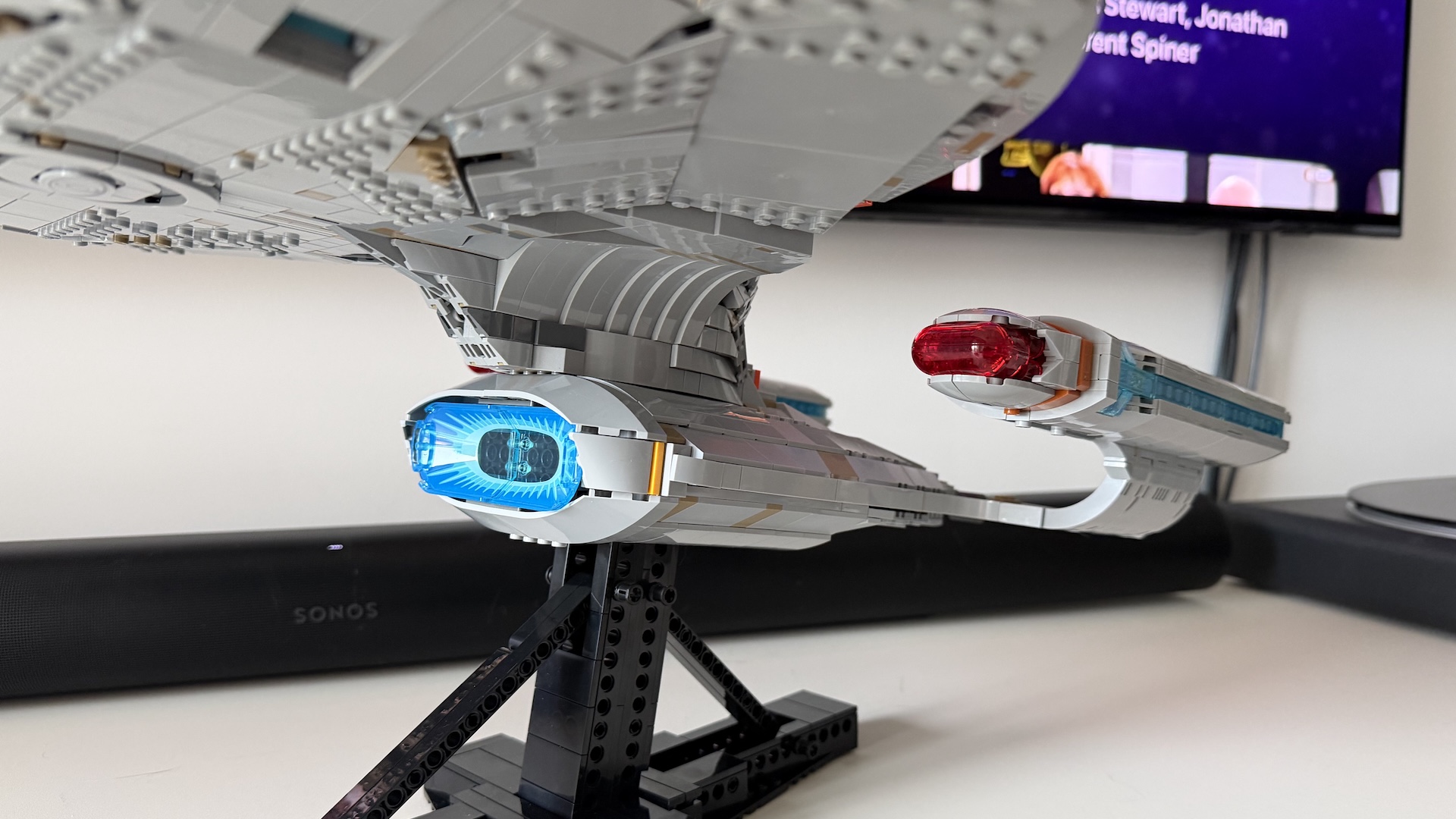 Le miracle s’arrête à partir du moment où on trouve que l’U.S.S. Entreprise n’est pas un bel engin. Lego ne le rendra pas plus beau aux yeux de celles et ceux qui détestent la direction artistique de Star Trek. Les designers ont fait de leur mieux en mettant un maximum de détails, et en offrant même quelques belles pièces tampographiées. Elles viennent sauver les quelques finitions douteuses constatées çà et là, confinant l’objet de décoration à la fameuse expression abjecte — « beau de loin, loin d’être beau ». On pense notamment à l’aspect rugueux de la coque, qui pâtit de beaucoup trop de tenons apparents alors qu’elle devrait être parfaitement lisse. On pourra pester aussi sur certains systèmes d’attache qui ne respirent pas la solidité, ni la praticité : cet U.S.S. Entreprise est à manipuler avec précaution. Il est de toute façon fourni avec un socle de présentation qui l’oriente légèrement vers le haut pour une impression de décollage.