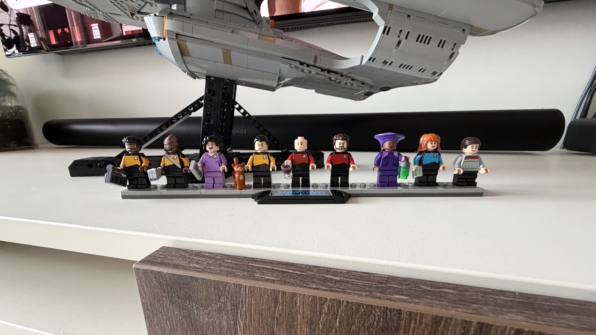 En somme, Lego n’arrive pas vraiment à rendre mignon Star Trek. Sauf à se pencher sur les figurines : toutes livrées avec un accessoire qui appuie leur personnalité, elles sont adorables. Le casting réunit ainsi Jean-Luc Picard, Data, Worf, William Riker, Deanna Troi, Beverly Crusher, Geordi La Forge et Guinan. Sans oublier le chat, qui vole la vedette à tout le monde. Lego a fait des efforts sur les coiffes de certains personnages, ainsi que sur les tenues, notamment au niveau des motifs (le noir déborde sur les manches). Le respect des couleurs n’est en revanche pas total : les costumes de Geordi La Forge, Data et Word sont plus vertes que jaunes dans la série datant des années 80.