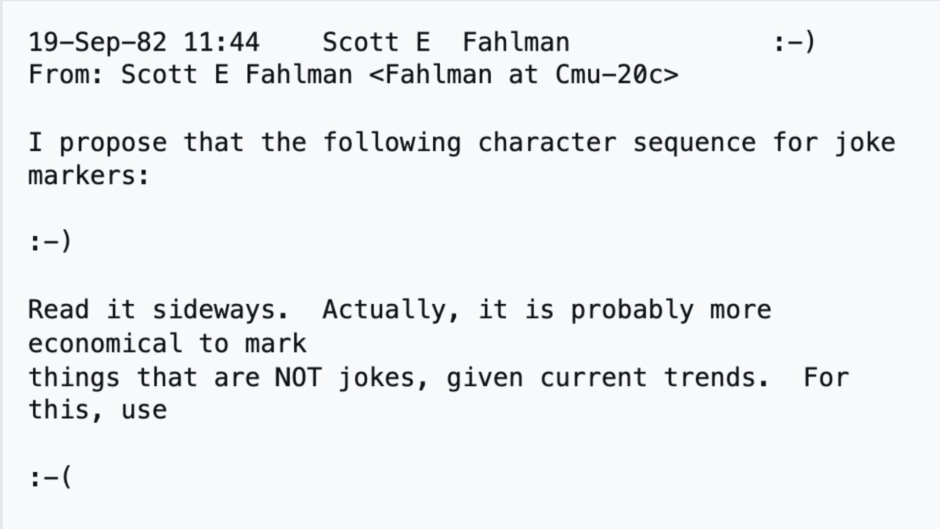 Il écrit simplement : « Je propose la séquence de caractères suivante pour marquer les blagues : :-) À lire de côté. » Puis il ajoute : « :-( pourrait servir pour les messages sérieux. Peut-être devrions-nous aussi l’utiliser pour les messages qui ne sont PAS des blagues, compte tenu des tendances actuelles. »