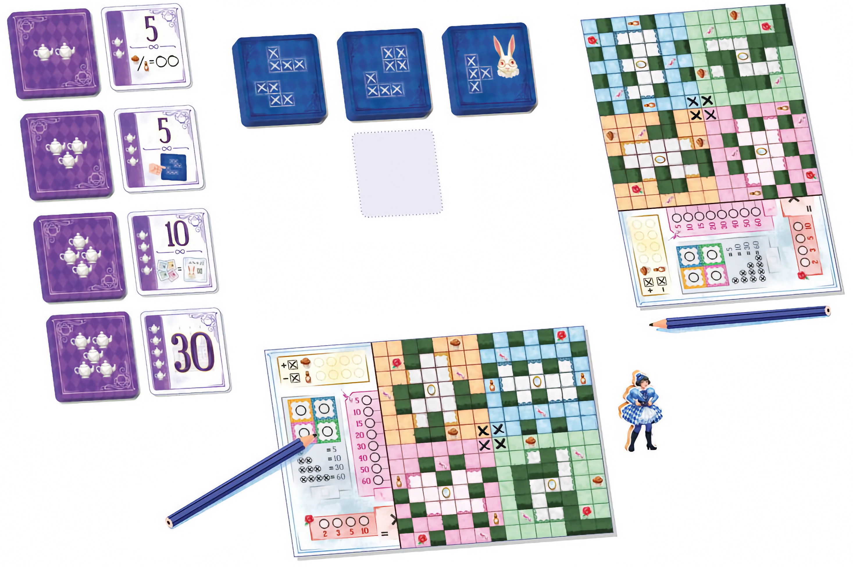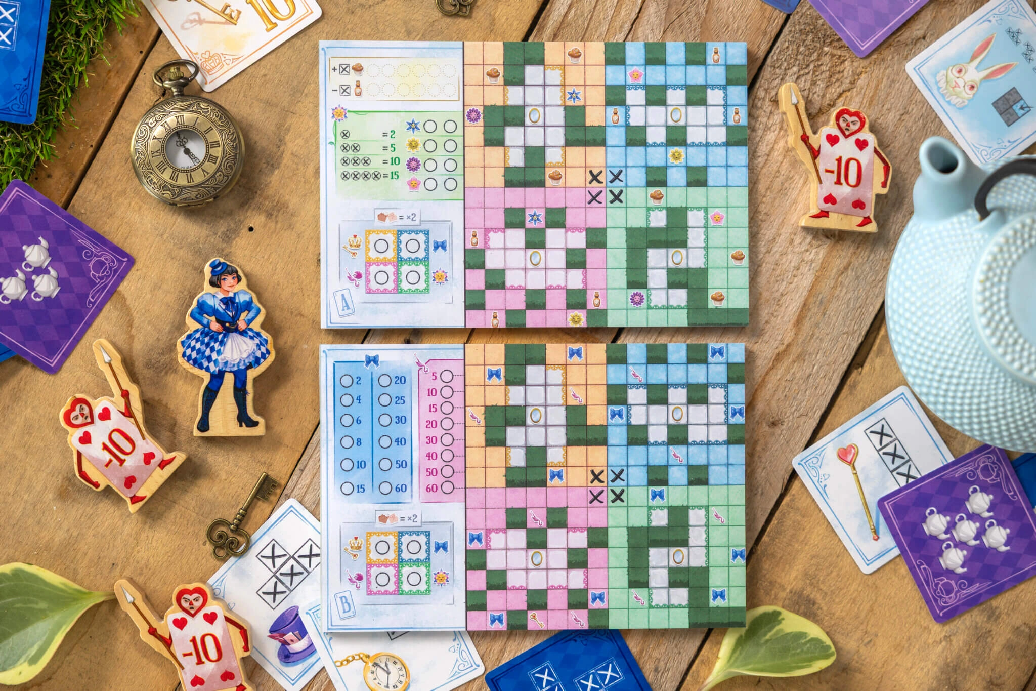 Les jeux à cocher, qu’ils soient « roll & write » (avec des dés) ou « flip & write » (avec des cartes), ont presque tous le même point commun : un thème quasi inexistant… ou totalement déconnecté de leurs mécaniques, même quand il est présent. Alice – De l’autre côté du miroir pourrait bien faire exception à la règle.