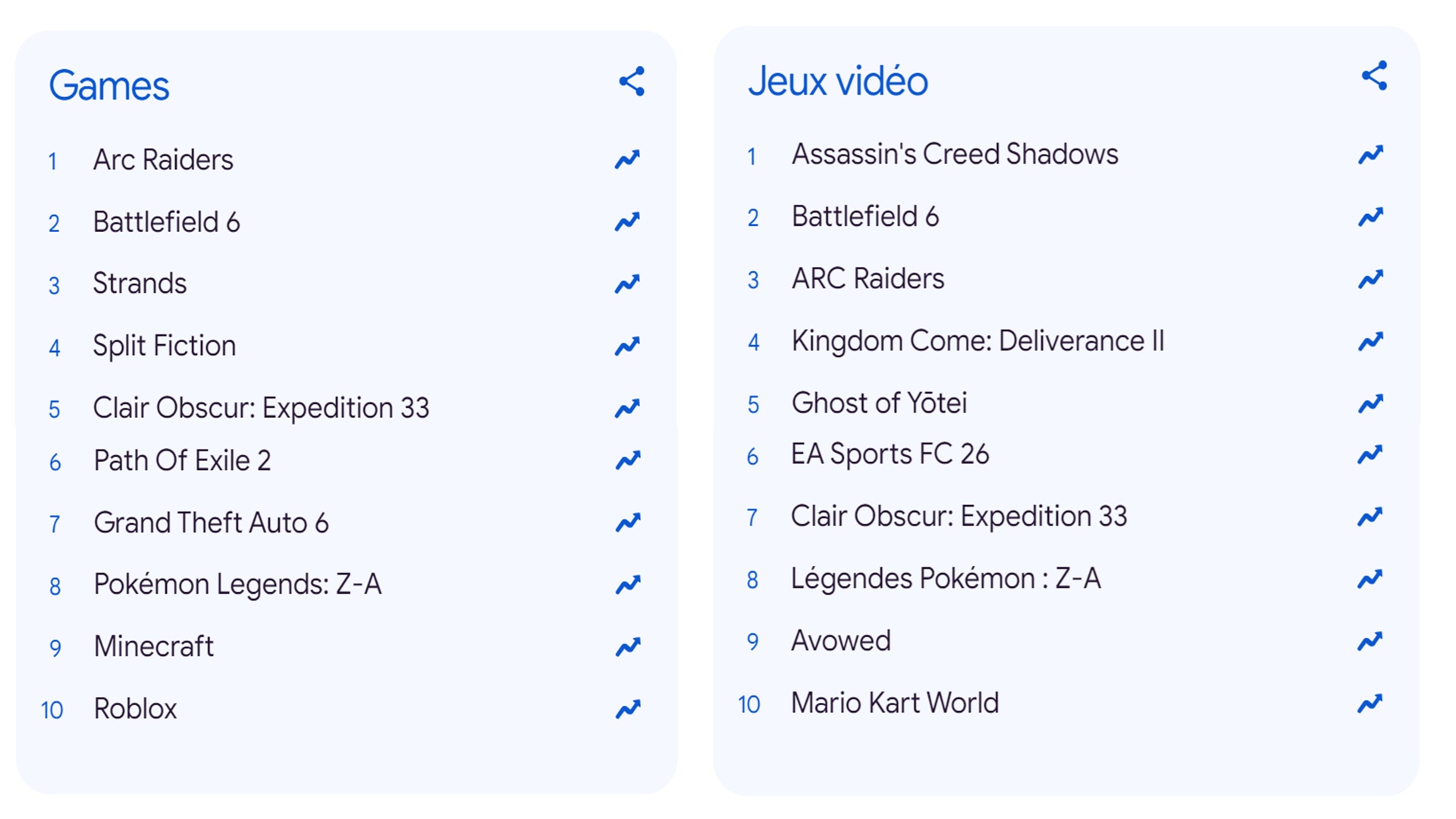 Vous noterez que le top des jeux les plus recherchés en France diffère largement, avec Arc Raiders seulement en troisième position, détrôné par Battlefield 6, et Assassin’s Creed Shadows qui se place en tête du classement. Ironiquement, Clair Obscur: Expedition 33 est relégué à la septième place chez nous.