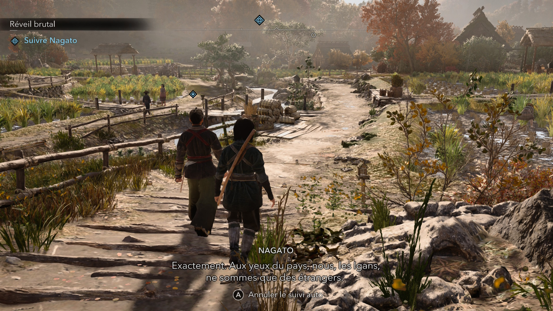 D’autant qu’on sent qu’Ubisoft a constamment misé sur la jouabilité de l’expérience, c’est-à-dire en garantissant un framerate à 30 fps le plus constant possible (il y a des chutes, et les cinématiques rament, mais la prouesse est là). Alors oui, sur Switch 2, Assassin’s Creed Shadows doit composer avec des sacrifices nécessaires : les ombres sont crénelées, les textures sont moins heureuses (ne sortez pas la loupe), les visages perdent en détails et en expressivité… Il n’empêche, les développeurs, qui maîtrisent leur moteur, parviennent à conserver ce qui fait l’ambiance du jeu, à commencer par les éclairages et par les quelques effets de particules (pétales dans l’air).