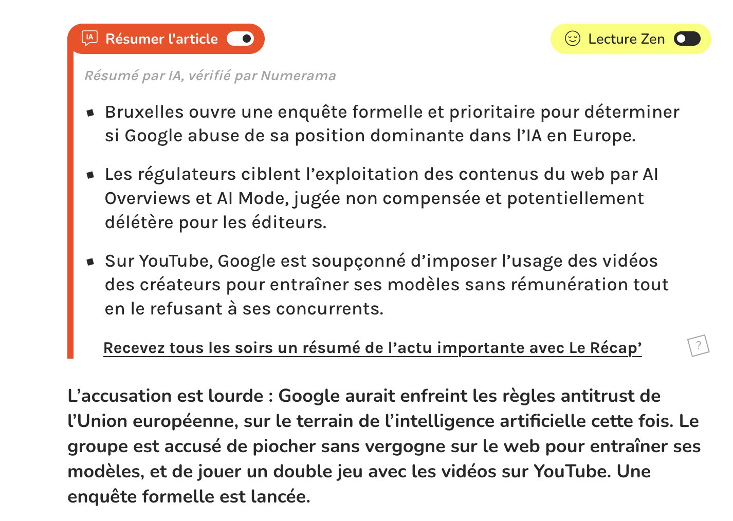 Il y a deux ans, nous lancions notre abonnement Numerama+ avec certains avantages qui étaient, pour l’époque, très en avance sur leur temps. Je pense notamment au résumé en bullet point « généré par IA, vérifié par Numerama », qui est devenu une marque de fabrique et un gage de transparence de notre média : nous allons évoluer avec les outils de notre temps, tout en gardant comme phare que notre mission est de vous informer.