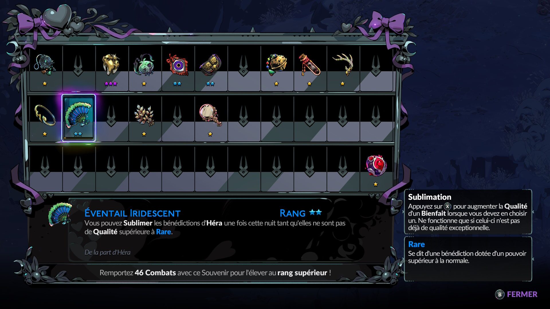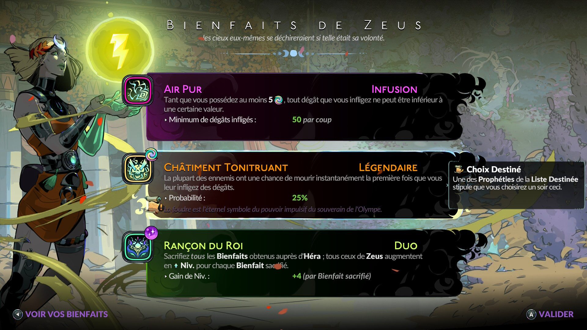 Ce n’est pas le seul élément qui permet de personnaliser le gameplay. Vous débloquerez des armes disposant chacune de plusieurs niveaux d’amélioration ET de différents styles d’utilisation. Citons aussi un système d’acarnes à l’évolution étonnamment riche et complexe, qui contribue à personnaliser votre approche des combats sous tous leurs angles (vitesse de déplacements, d’esquive, jauge de vie et/ou de mana, quantité de secondes chances en cas de mort, etc.). L’arbre des possibilités est tel qu’il mériterait presque un article entier tant il offre de variété, et on n’a même pas évoqué ici les souvenirs à débloquer auprès des divinités et autres PNJ croisés durant l’aventure, conférant eux aussi leurs bonus à améliorer au fil des utilisations.
