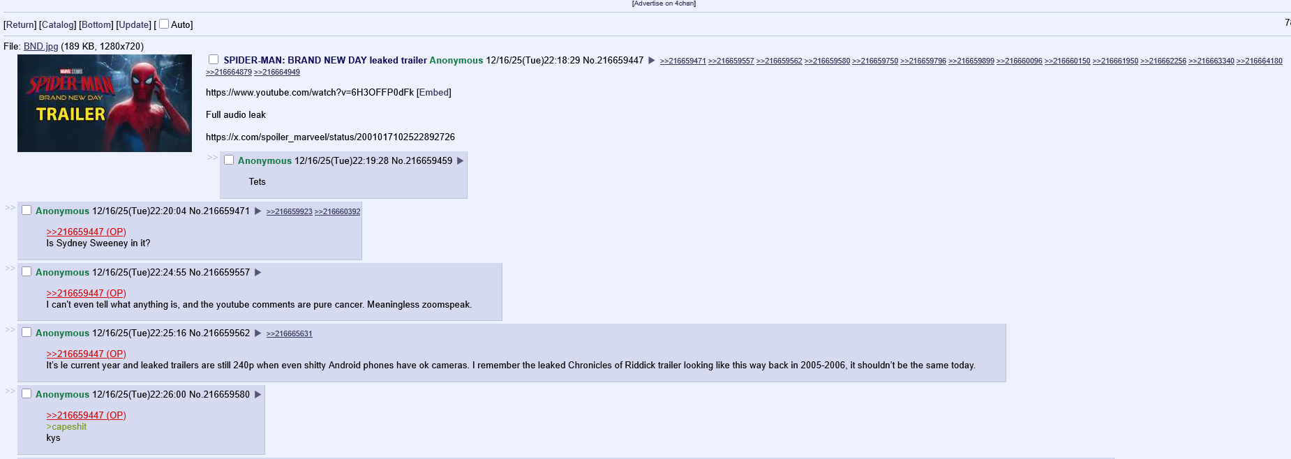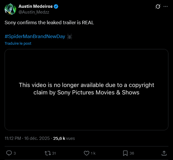 Il est toutefois possible de la retrouver sur d’autres hébergeurs un peu plus discrets et moins disposés à coopérer promptement avec les titulaires de droits — comme 4Chan. En l’espèce, selon les notifications de retrait, c’est le studio Sony Pictures qui est à la manœuvre, puisque c’est lui qui possède la franchise Spider-Man pour le cinéma