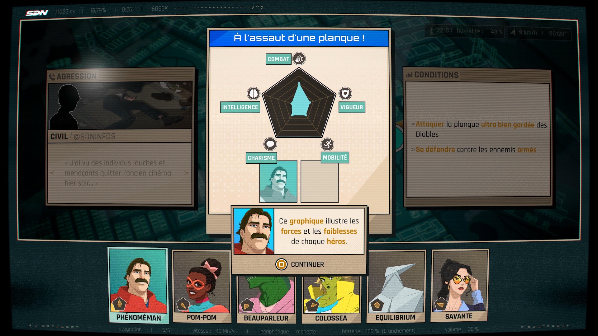 Mais Dispatch n’est pas qu’un simple jeu narratif pendant lequel on appuie sur une touche toutes les cinq minutes. Il repose la majorité de son gameplay sur une gestion relativement fine de l’équipe, lors des heures de travail. Ainsi doit-on envoyer des aspirants super-héros remplir des missions dont l’intitulé renseigne sur les caractéristiques à maîtriser pour garantir la réussite. S’il faut négocier, vaut mieux envoyer quelqu’un de charismatique. À l’inverse, certains objectifs nécessitent la force pure. Tout ce beau monde gagne des points d’expérience pour matérialiser la notion de progression, en accord avec l’histoire. Bref, Dispatch sait être cette simulation gentillette du manager, contraint de superviser des employés peu coopératifs.