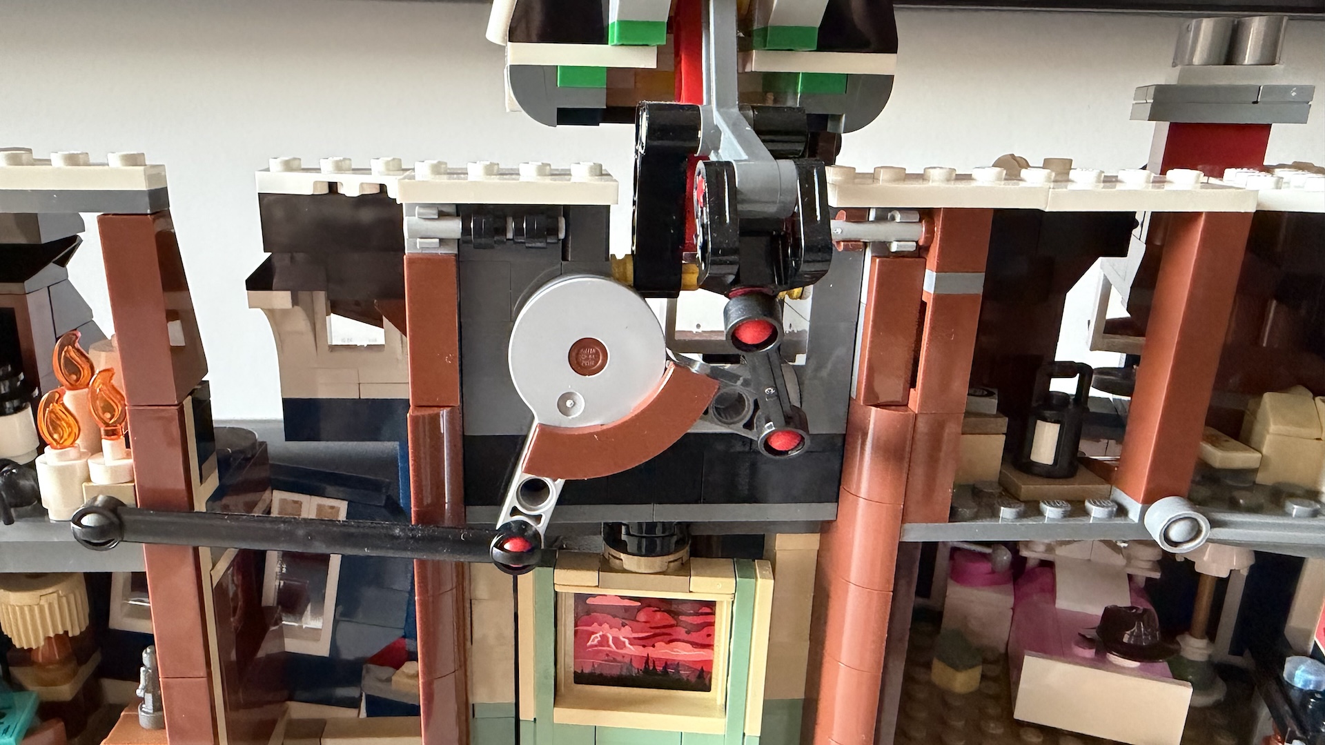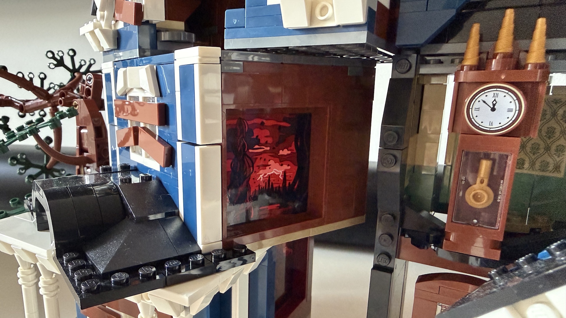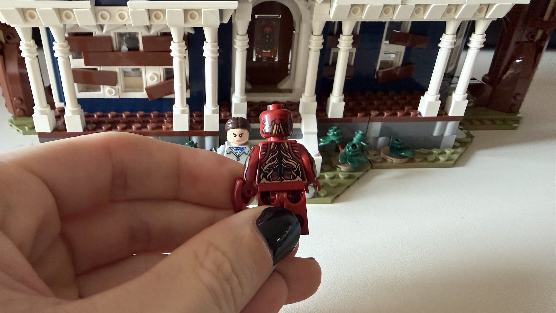 Quand on regarde les différentes photos promotionnelles de la maison Creel en Lego, on peut se dire qu’elle ne paie vraiment pas de mine. Comme d’autres bâtiments thématiques, les ingénieurs privilégient les détails et la décoration à l’habitabilité. En résulte une demeure étroite et peu impressionnante une fois posée sur un meuble, et à la jouabilité, semble-t-il, limitée. Mais ces apparences sont bien trompeuses et un mystérieux mécanisme anime les lieux : quand on tire de chaque côté de la maison, elle se fragmente — sans se briser en mille morceaux — et laisse apparaître le Monde à l’Envers, plus spécifiquement le Repaire mental interdimensionnel de Vecna.