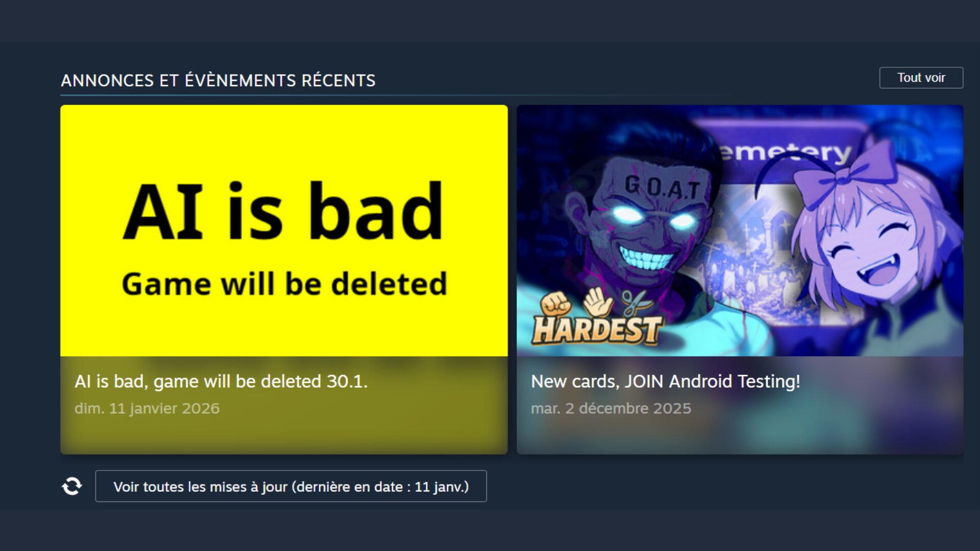 D’autres avis sur Steam relèvent « la médiocrité et le manque d’âme répugnants » du titre, ou affirment qu’il « n’a aucune qualité ». Des critiques certes sévères pour un simple jeu gratuit, mais qui semblent surtout viser l’usage massif de l’IA dans sa conception. On pourrait croire qu’un tel échec marquerait la fin de l’histoire, Hardest étant condamné à sombrer lentement dans les limbes du catalogue de Steam. C’était sans compter sur l’arc de rédemption de Rakuel, qui a eu une révélation. Le 10 janvier 2026, le développeur indépendant a publié un communiqué annonçant qu’il retirera son jeu de la plateforme d’ici la fin du mois.